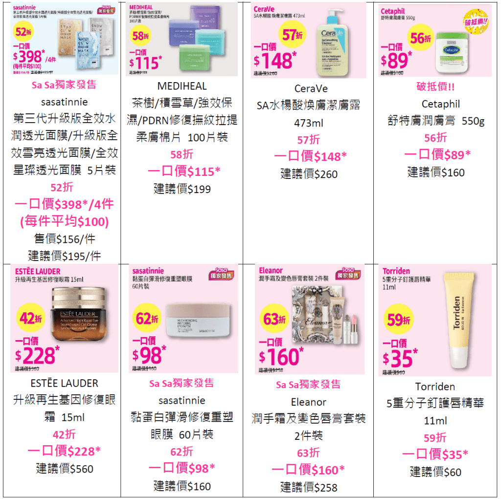 秋冬時常遇到皮膚乾燥、甩皮和痕癢情況,最需要高效滋潤產品重點呵護每寸肌膚!人氣產品sasatinnie升級版全效水潤透光面膜,每片面膜為肌膚導入40ml精華,一敷快速補水,瞬間水潤透亮,MEGA SALE一口價$398/4件立即入手!低至56折Cetaphil潤膚膏,24小時長效滋潤肌膚,提供補濕鎖水雙重功效;Eleanor潤手霜及變色唇膏套裝一口價$160,同時為手部及唇部帶來滋潤,換季都能自信展現白滑肌膚,告別乾燥煩惱!