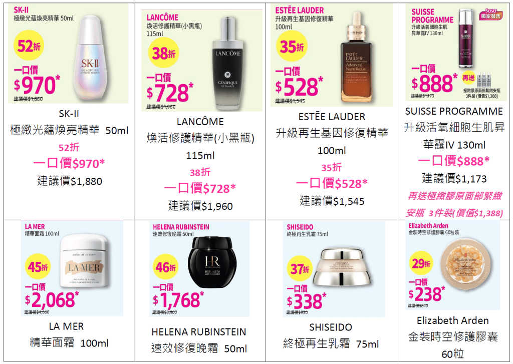 在秋冬季節,肌膚保養需全面升級,以對抗乾燥天氣!莎莎匯聚了SK-II、LA MER、LANCÔME、ESTĒE LAUDER 等全球熱門品牌,提供低至29折的超值折扣。Estée Lauder 的升級再生基因修復精華(小棕瓶)100ml 一直是暢銷品,此次特價僅$528,透過專利三肽-32分子快速滲入肌底,恢復肌膚彈潤細膩,展現水潤光采;LANCÔME 小黑瓶更以低至38折優惠登場,從底層補充養分,舒緩並穩固肌膚狀態;此外,貴婦級 LA MER 精華面霜只需$2,068 即可入手,即時帶來深層滋潤,淡化細紋並提亮膚色。別錯過這一年一度的囤貨機會,讓你的肌膚持續保持水嫩滑順!