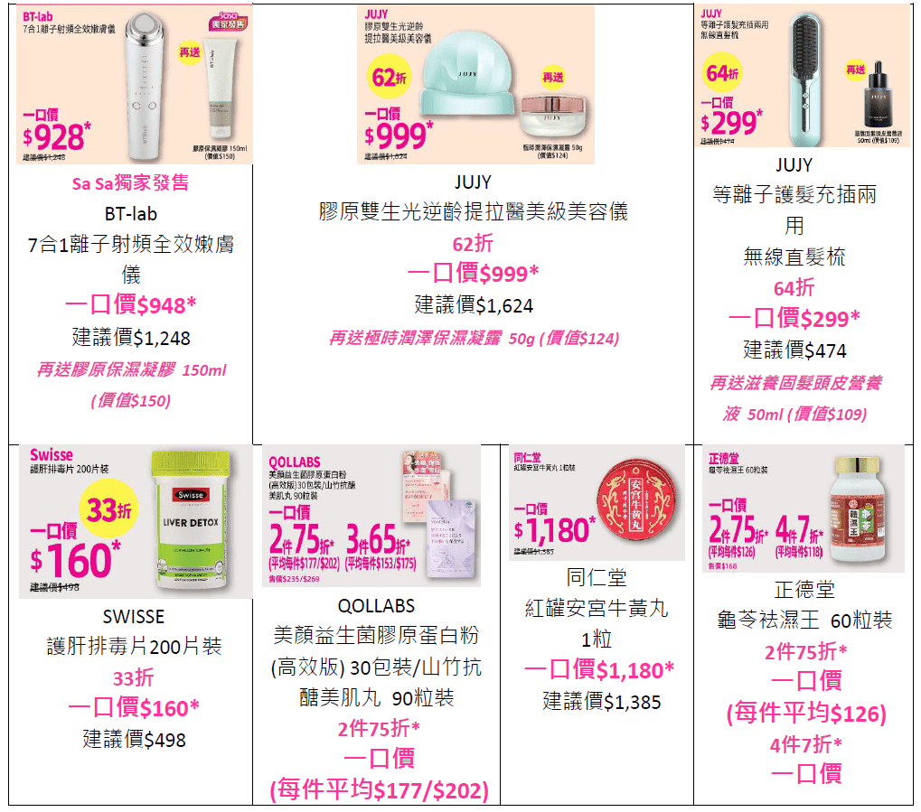 BT-lab全新推出7合1離子射頻全效嫩膚儀,齊集各種模式、LED光療及RF射頻,一機擁有多重護膚功能,幫助改善肌膚質感,MEGA SALE一口價$928,再送膠原保濕凝膠(價值$150),立即火速入手!64折即時擁有JUJY等離子護髮充插兩用無線直髮梳,高達4000萬高濃度等離子技術,打造多變頭髮造型同時護髮,配合贈品滋養固髮頭皮營養液(價值$109),輕易養出光澤秀髮。想由內而外散發光彩,日本暢銷QOLLABS美顏益生菌膠原蛋白粉及抗醣美肌丸,為肌膚提升彈性光澤,MEGA SALE期間3折65折,平均每件$153起!