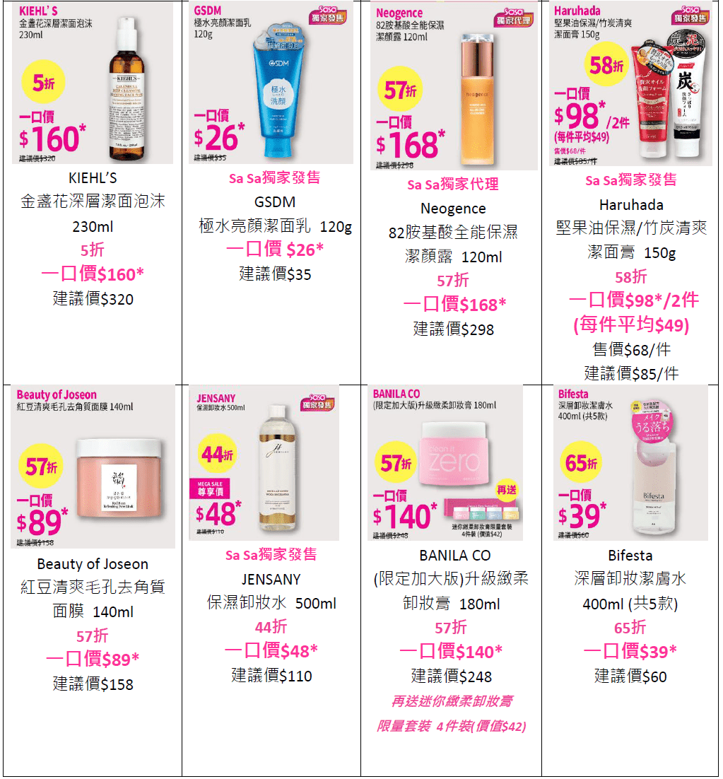 想擁有透亮美肌,潔面卸妝是不可或缺的首要步驟!秋冬季節更要選擇具保濕及潔淨力產品,莎莎匯集多款星級潔面及卸妝產品,5折入手KIEHL’S金盞花深層潔面泡沫,一瓶做到清潔、舒緩及保護肌膚屏障功效;韓國大熱Beauty of Joseon紅豆清爽毛孔去角質面膜一口價$89,深層清潔毛孔,不造成肌膚緊繃;韓國熱銷BANILA CO升級緻柔卸妝膏輕易溶解防水彩妝,同時滋潤煥活肌膚,59折即可入手再送迷你緻柔卸妝膏限量套裝!