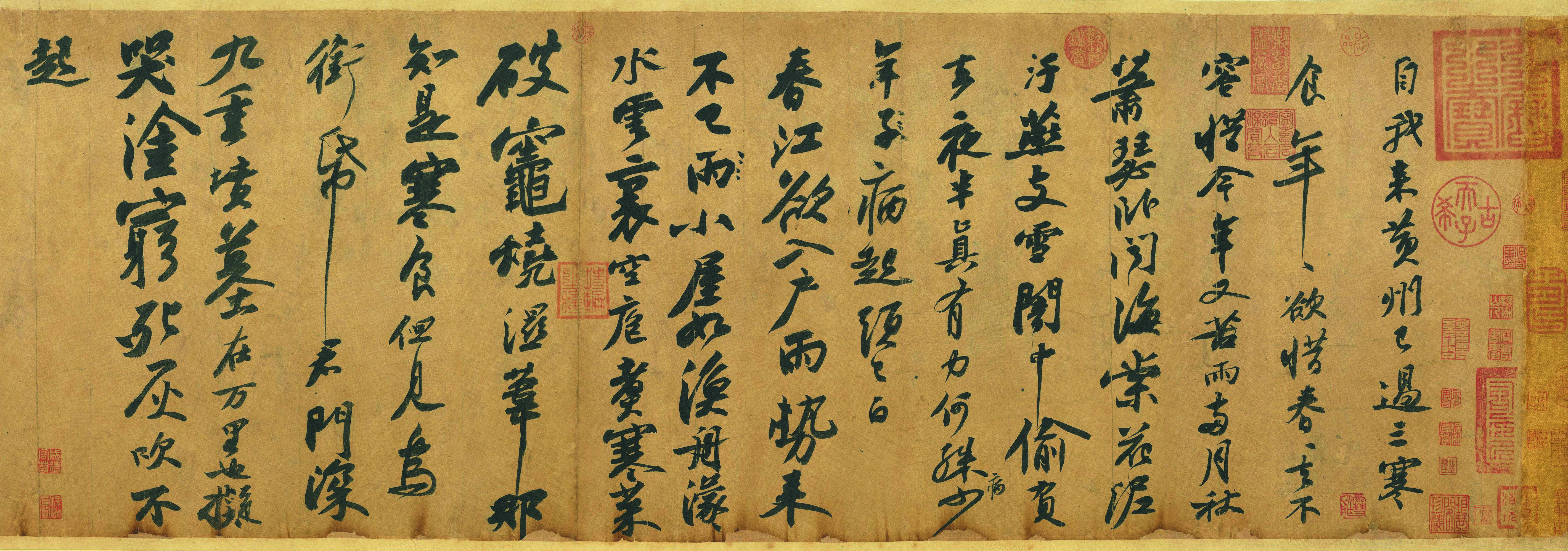 《富山春居圖》無用師卷在台北展出至11月18日,睽違10年的蘇軾《寒食帖》於20號接力。此帖既是書法珍品,亦為東坡「黃州寒食詩」原稿,有着雙重藝術創作的份量。其時蘇軾被貶黃州第三年,於生命低潮觸景傷情,為《寒食帖》加上東坡人生寫照這層意義。寒食節有禁火習俗,《寒食帖》卻宿命似的惹火。此帖曾藏於清宮,英法聯軍火燒圓明園時險遭焚毀;後流落民間再遇火災,雖又逃過此劫,卻在手卷下沿留下火灼痕跡;之後輾轉被日本收藏家菊池惺堂購得,翌年關東大地震菊池所藏字畫幾乎全數被火燒毀,幸得他冒死從烈火中救出,《寒食帖》才得以保全。