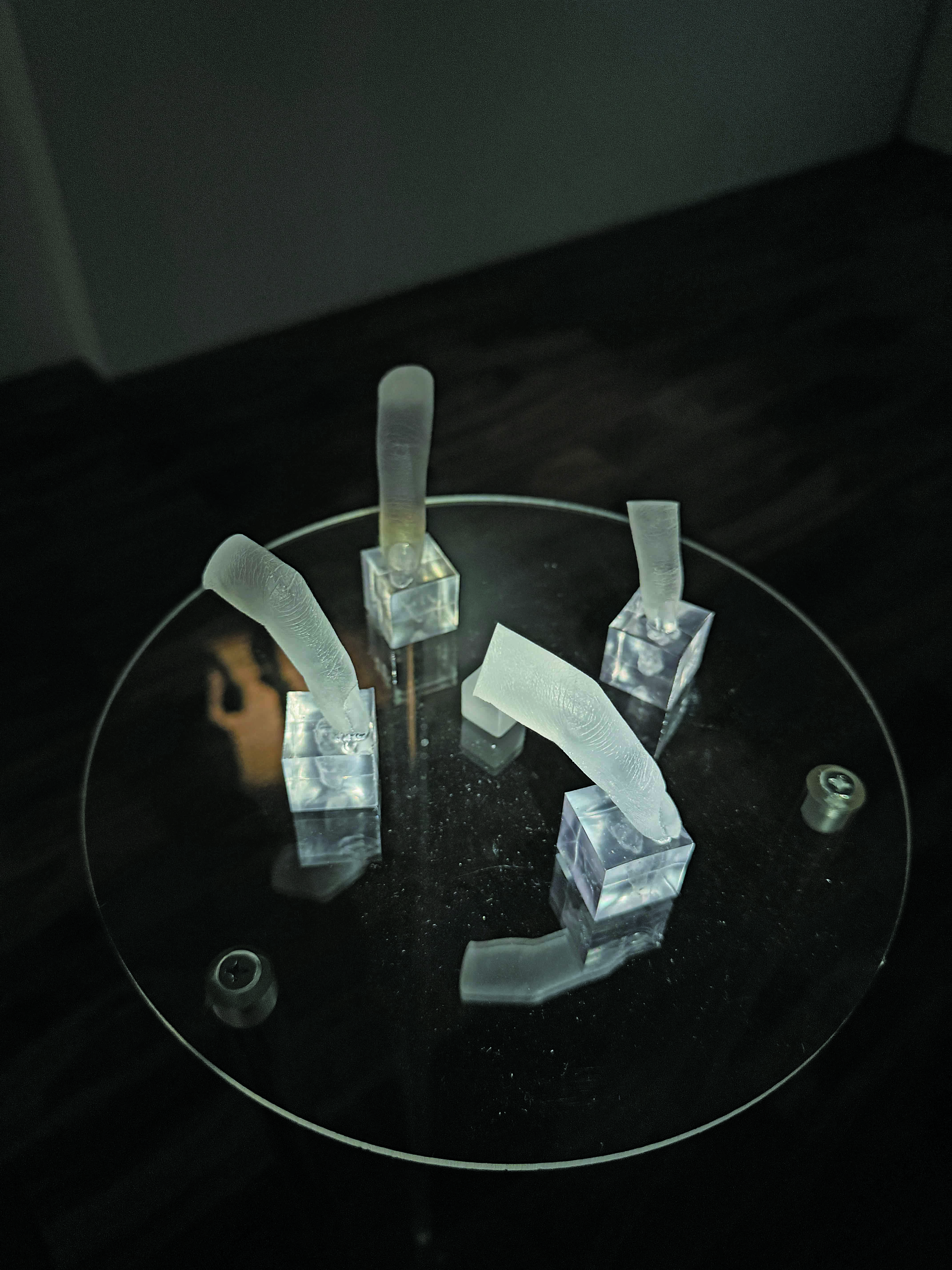 對比場內另一件樹脂作品《In the Drift》,平滑的弧狀外形像是還沒有完全成形的手指,就如標題所描述一般在漂泊中守候智慧的誕生。同時亦呈現了作家邁克爾.斯萬維克同名作品中,女主角被另一個星球生物跟蹤的狀態。這兩件樹脂作品都展現出被牽制的壓抑感,就像人們匆忙橫越馬路時,即使迎面而來的車輛反覆鳴笛和燈光直射,我們仍然無法立刻作出反應,只可以佇立在原地而無法逃離。