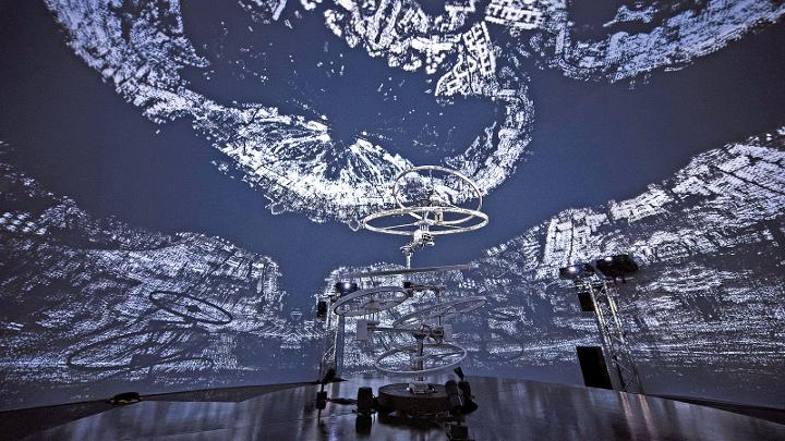 走進幽暗的半球體內,首先映入眼簾的是中央緩緩轉動的多個圓輪,宛如星體的軌跡,也對應着人類身體的七個脈輪。作品分為四個場景:第一章以點雲呈現香港地標—赤鱲角機場、青馬大橋、山頂凌霄閣等—從城市地圖取材,在空間中反覆交疊出曼陀羅般的圖像;彷彿重組現實地點,把日常世界顛倒過來,像在天空俯瞰城市的景色,同時也在窺視內心。