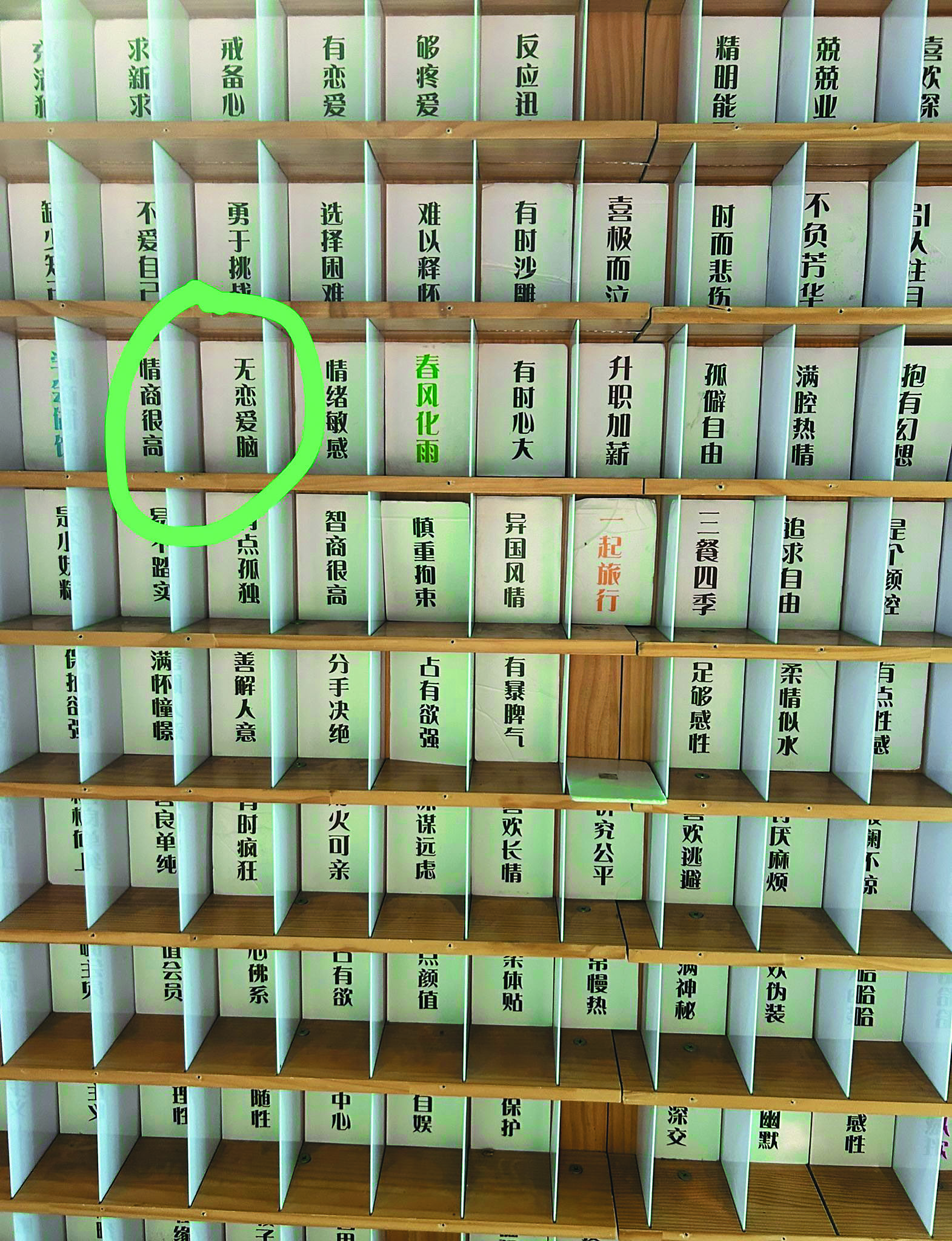 在一個主題館看到一大堆送人的四字詞,成了一個四字詞牆壁,當中包括了「無戀愛腦」。