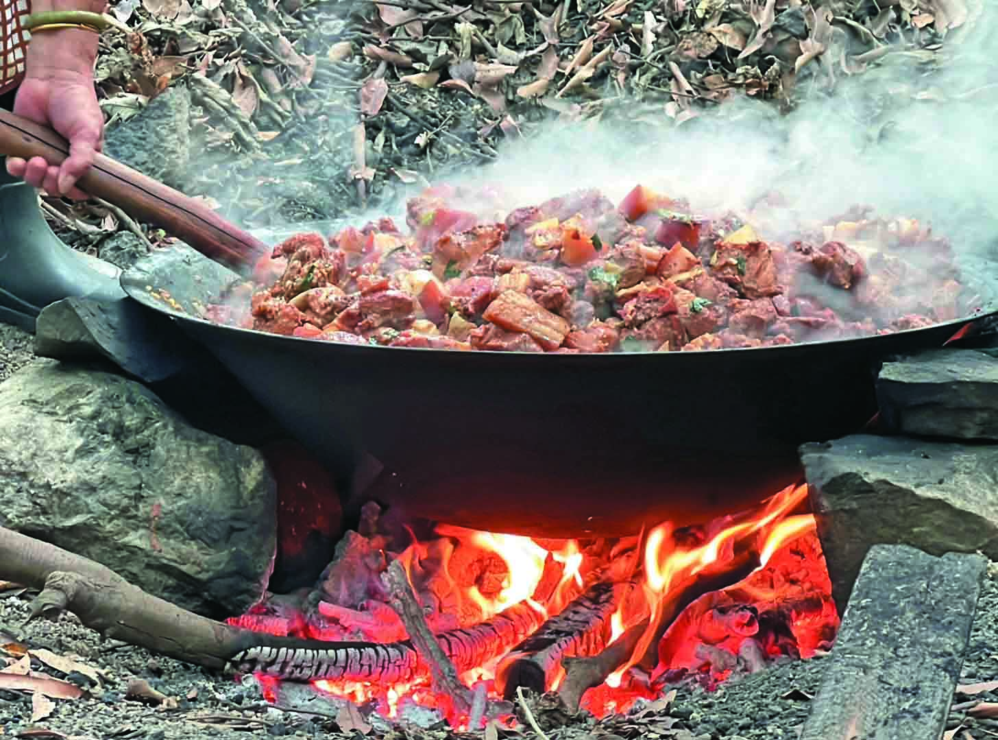 食山頭那天朝早,抬一隻新鮮屠宰並去了骨的生豬上山,就地切細件落大鑊炒。爐灶是挖坑而成,在附近撿執荔枝樹的枝椏燒火,鏟來一大堆枯葉煽旺火頭。柴火炭火都有一個特性,燒起的火焰不僅特別猛烈,而且不像燃氣爐只在鑊底發功,而是不斷冒升致包圍覆蓋整個鑊面,令鑊內的食材也受火焰波及,因而也直接受火炙和煙燻,香味自然更勝一籌,其實與炭燒煲仔飯更好吃的原理一樣。值得一提是當日山頭有飯供應,也是用柴火即煮的大鑊飯,是名副其實的「燒飯」。煮大鑊飯少一點經驗都「大鑊」,因為落幾多水,煮幾耐,全靠師傅現場判斷。只見聯哥在煮飯中途揭開鑊蓋,用特大鑊鏟兜炒已開始收水的生米,然後推走燒得正紅的柴枝,只養着高溫殘焰,將大鑊飯完全包圍,讓生米焗成熟飯。