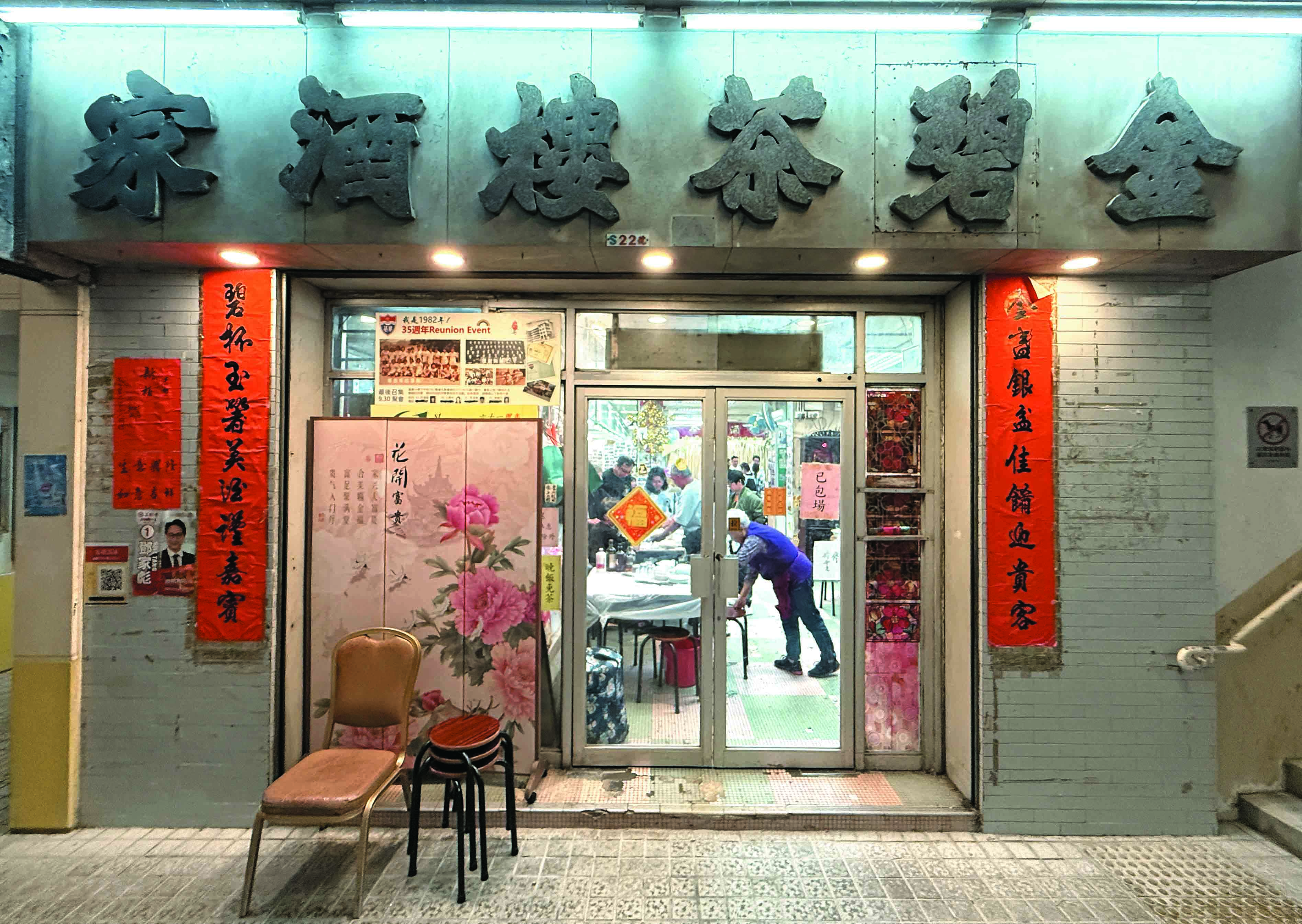 金碧格局的老派,應該從未大變過,難怪更叫人不捨。的確如此,在金碧樓一角不算大的樓面舖位,門口招牌已是歷史的明證,「金碧茶樓酒家」六個大字是從右排向左,非現代流行從左到右英文式排向(見圖)。