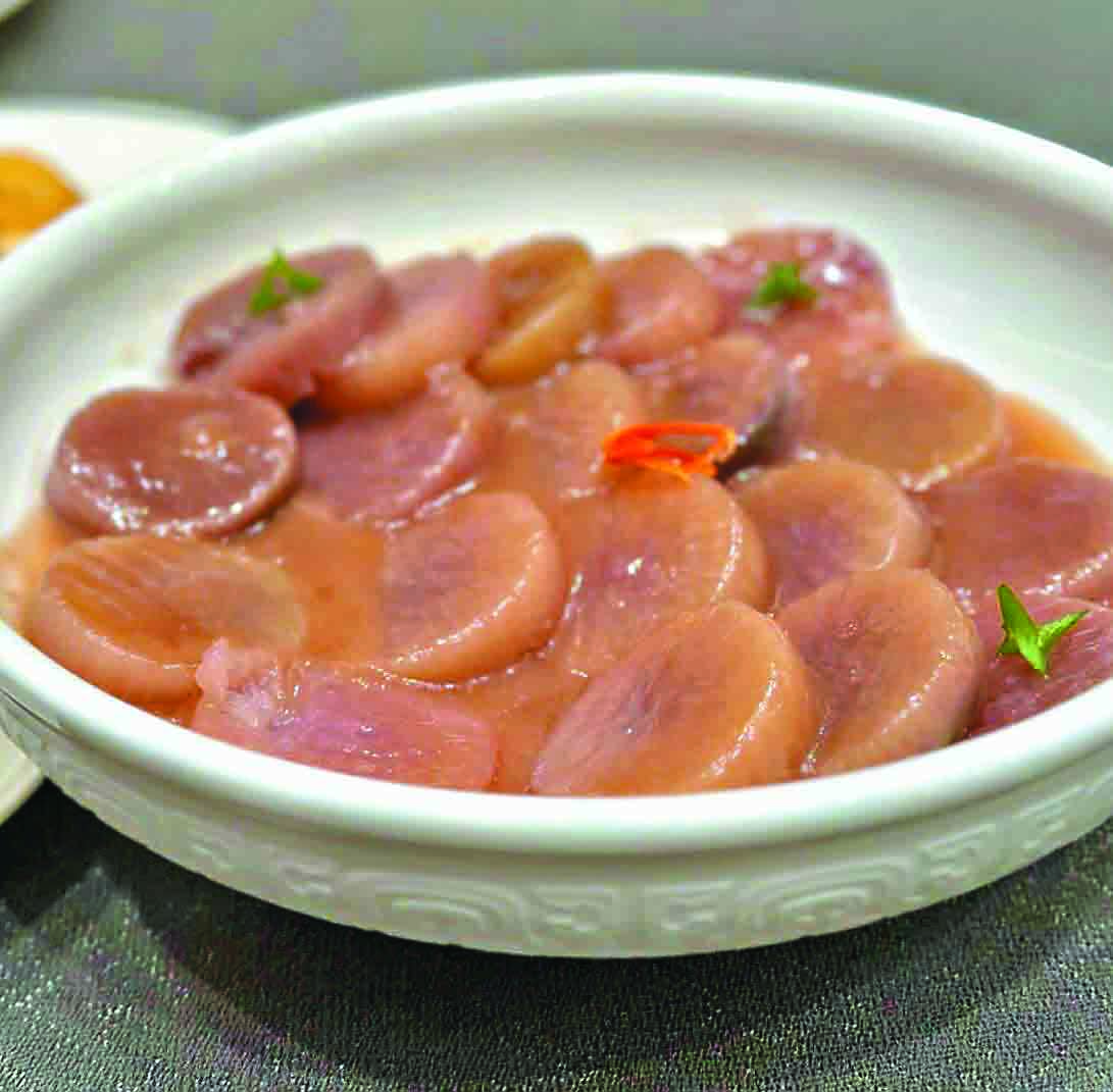 寧式十八斬是餐廳招牌名菜,是食客通常必點之菜,斬的是東海梭子蟹,餐廳用液化氮把蟹冷凍至攝氏零下一百九十度,目的是把細菌消滅。大廚刀功一流,每件蟹都斬得同樣大小,艷紅蟹膏賣相漂亮,大廚用秘製醬汁和花雕酒把蟹醃得鮮香醉人,一食難停。我最愛的前菜是大紅袍燻鹽鹵肥腸,豬大腸肥美鮮香兼有𡁻頭,蘸青椒醬食是人間美味。梅煮七彩花生食的是雲南彩色花生,花生友不可錯過。