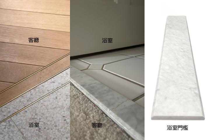 2. 為美觀捨門檻,防水門檻太矮:大廈原樓板沒有預留淋浴區下沉結構,裝修時又沒加厚地台,卻為了「客廳浴室齊平」的簡潔效果,取消了門檻。驗收時師傅搭了臨時門檻做閉水試驗,拆後真正的防水門檻只剩10-20mm高,水一積滿就溢出到走廊。