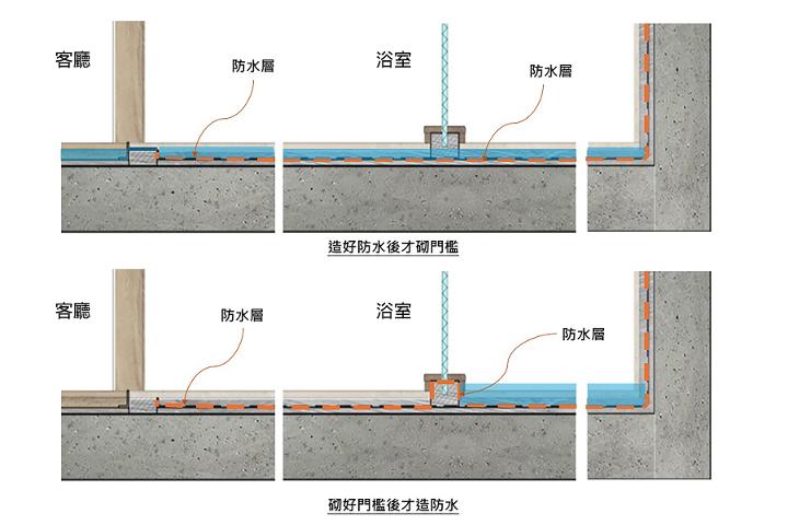 1. 門檻後加,防水斷層:師傅先刷完防水,才補裝淋浴間門檻,且沒重新補刷防水。淋浴時水透過瓷磚縫隙滲到防水層,本應被門檻擋住的水,直接從門檻與防水層的「斷層」流出,順著浴室底層流向客廳。