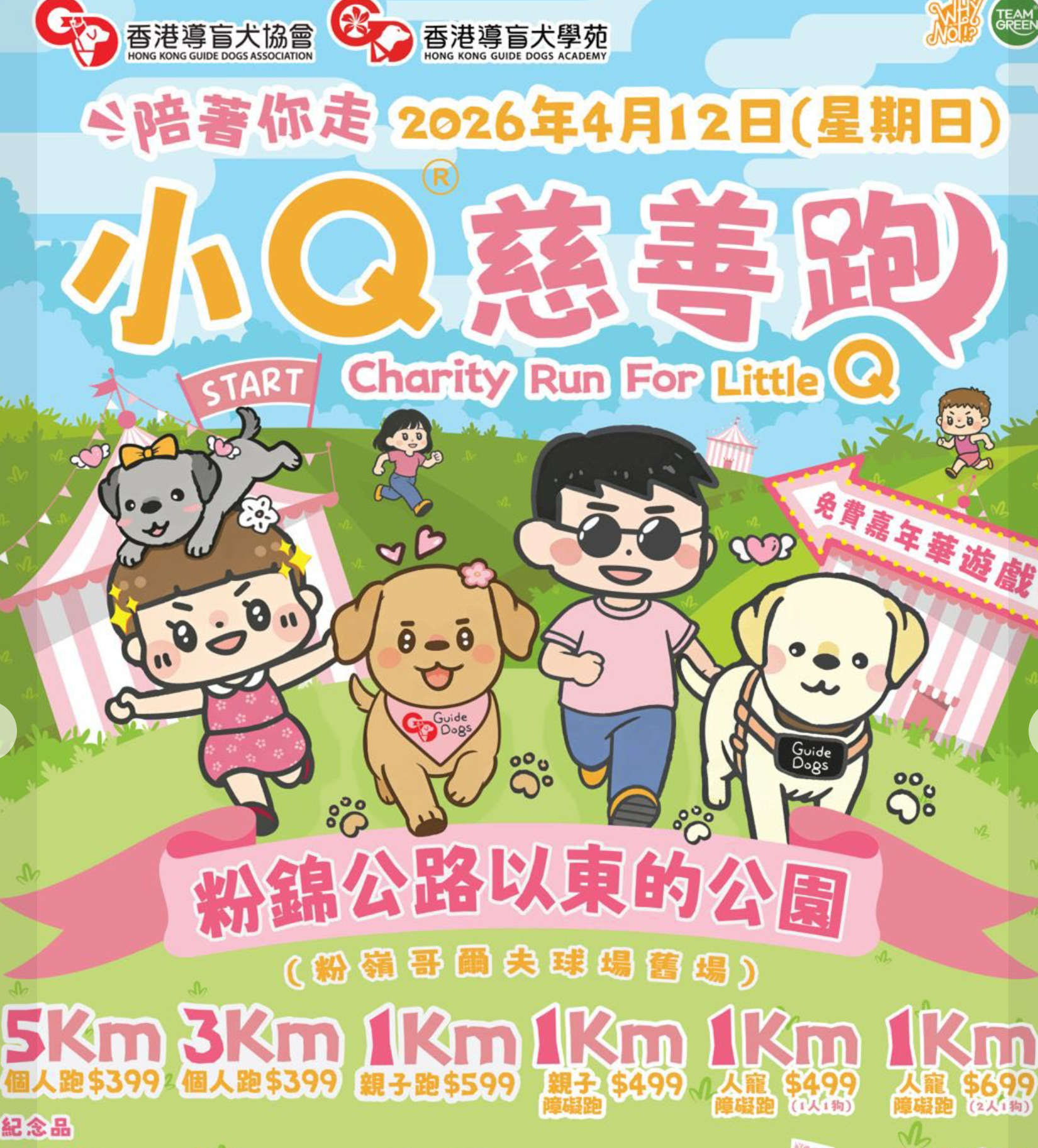 4月12日(本周日),香港導盲犬協會將於粉嶺哥爾夫球場舊場公園舉辦「小Q慈善跑」,以實際行動延續這份愛。活動設有個人跑(5公里/3公里)及親子跑(1公里)組別,每位參加者皆可獲精美選手包,親子組冠軍更可獲香港海洋公園門票兩張。透過比拼速度,亦將愛心傳遞出去。