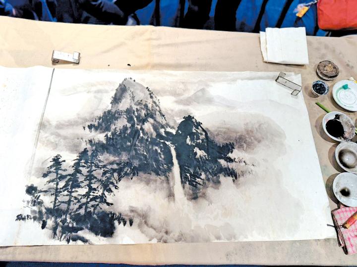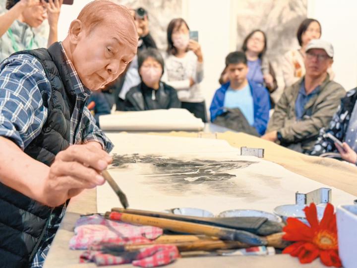 75歲的陳勉良,是著名嶺南派國畫大師,這個星期在中環大會堂舉行畫展,為了與同好者交流,平日有開班授徒的他,特別選出一個時段露兩手,在短短45分鐘內,畫成一幅氣勢磅礡的山水畫,高聳山巒,霧鎖絕嶺,飛瀑流瀉,松影浮漾湖上,盡顯大師風範。