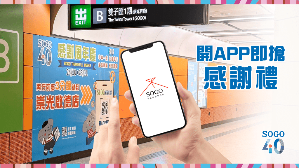 崇光推出「開App即搶感謝禮」活動,新登記及現有SOGO Rewards會員只需透過SOGORewards App 於推廣期內,掃瞄郵寄入戶的通函傳單、港鐵或巴士廣告上的指定二維碼,即有機會獲得$30 或$100 電子優惠券,更可即時於感謝周年慶期間使用,盡享更多優惠!