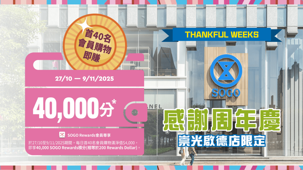 適逢啟德店開業1周年,10月27日至11月9日期間,崇光啟德店將特別推出限時禮遇,每日首 40 名單一購物滿$4,000的顧客,可獲高達 4 萬 SOGO Rewards 積分 2,可直接兌換成 200 Rewards Dollar,於逾千參與專櫃作現金使用。此外,隨後感謝周年慶 Part 2 活動期間購物,更有機會贏得全城矚目的樂壇盛事門票,活動詳情可留意崇光最新公布。