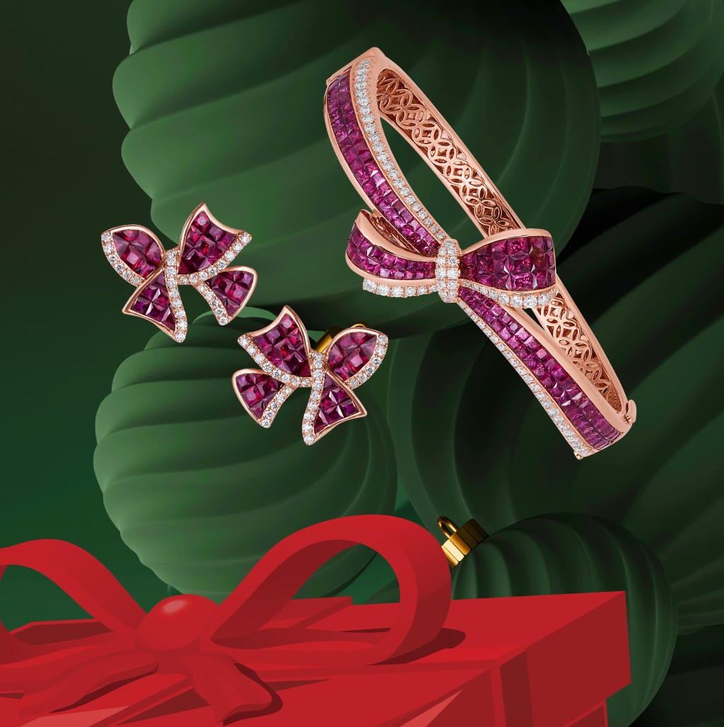 《瑰麗紅寶石》系列以紅寶石和密鑲鑽石配18K玫瑰金打造出禮物盒上的蝴蝶結形狀,閃爍的美鑽寶石重現出手繫蝴蝶結的靈感美態,其璀璨光芒不但立體迷人,亦予人開心喜悅的感覺。