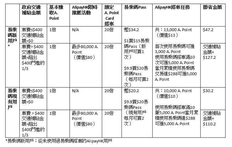 用戶更可於「A. Point」專區或「交通」頁面進入活動頁參與易乘碼搭車任務,包括首次使用易乘碼搭車、用易乘碼搭夠10次車和當月車費累計超過港幣288元,均可獲得額外A. Point獎賞,最多可獲港幣13元A. Point積分 。