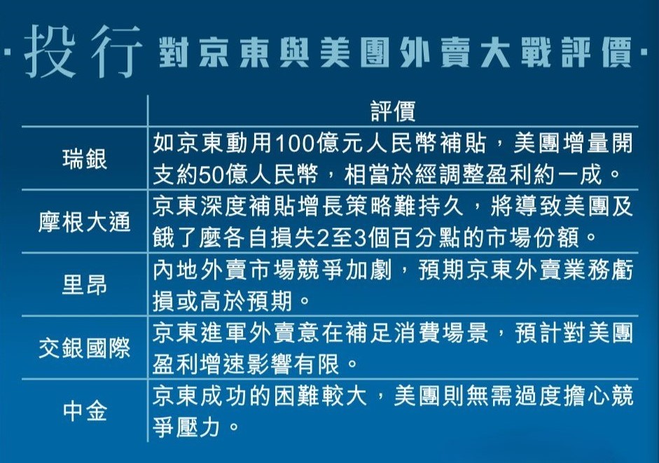 京東今次加入外賣大戰,投行普遍並不看好,大多認為美團在內地外賣行業深耕多年,市佔率相當大,而京東補貼難以持續。瑞銀認為內地外賣業務極具挑戰性,要長期投資,達到一定規模之前難獲盈利,投資回報率極具不確定性,該行估計京東外賣業務每張訂單虧損約七至九元人民幣,全年要投資八十至一百億元人民幣。以京東動用百億元人民幣投資計算,估計美團亦將增加近五十億元人民幣的投資,相當於經調整盈利約一成。