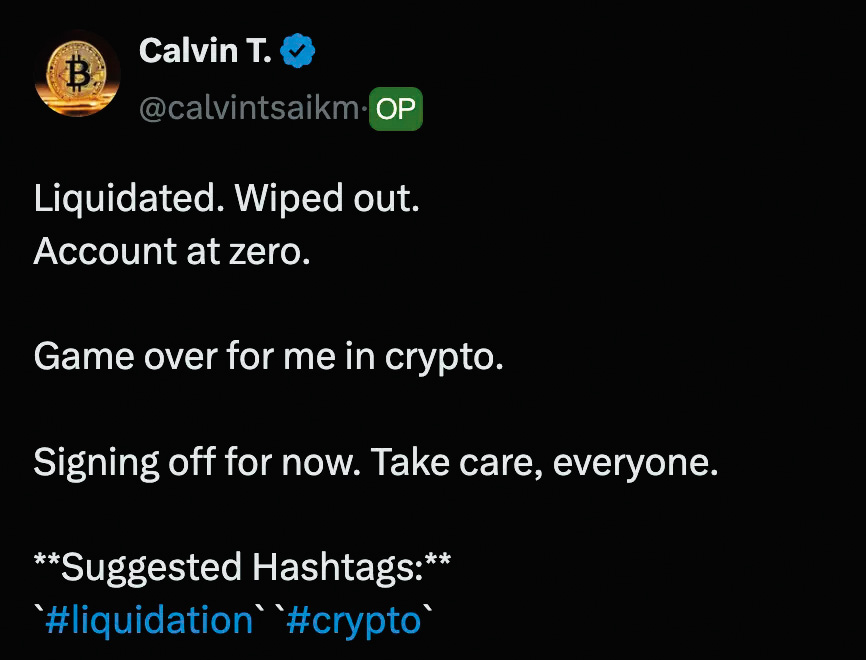 上周中,以量化交易及做市策略知名的本港加密貨幣交易員蔡嘉民,突然在個人社交平台X上連發多個帖文,稱交易帳戶被清零,形容自己目睹整個投資組合在短時間內蒸發,「就好像發了一場超現實的噩夢」。
