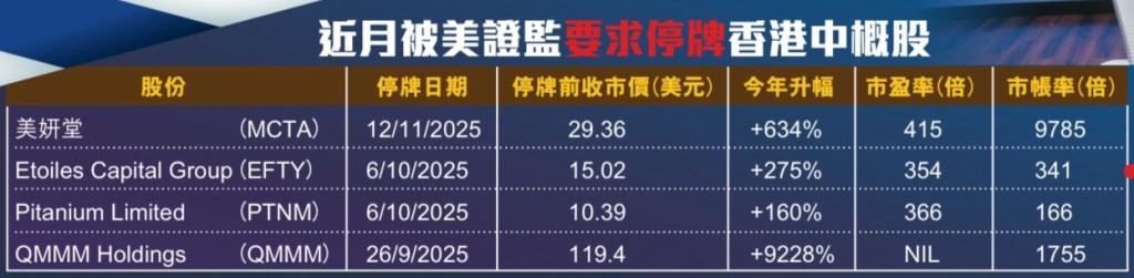 證交會強勢要求QMMM停牌後,不足兩個月後再勒令三間來自香港的上市公司停牌。除了美妍堂外,還有經營美容護膚品牌的Pitanium Limited(PTNM),以及提供綜合投資者關係服務的Etoiles Capital Group(EFTY),三間公司均被指有身份不明人士透過社交媒體操縱股價。