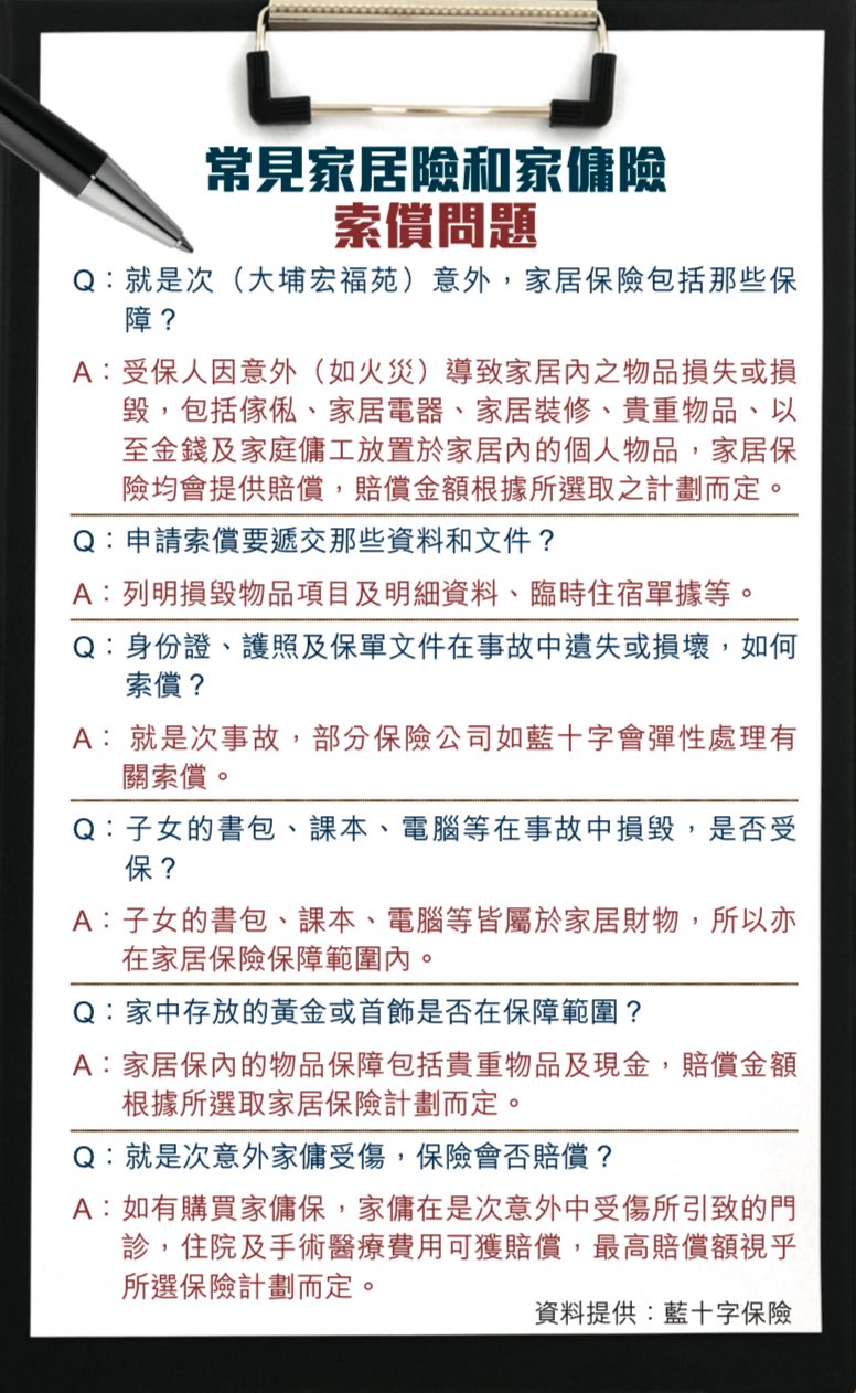 今次火災亦可能影響住戶聘請的家傭和飼養的寵物,如住戶有購買家傭保和寵物保,可按實際影響提出索償。藍十字保回覆本刊查詢時指出,若寵物不幸在是次事故中身故,部分計劃會提供殯葬服務費用。
