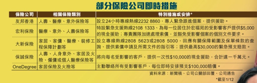 至於人壽保、意外和住院醫療保險方面,香港保險業聯會行政總監劉佩玲表示,業界已採取特別安排,主動聯繫受影響客戶,並優先處理宏福苑相關賠償。例如人壽保險索償將毋須死亡證,以加快流程。