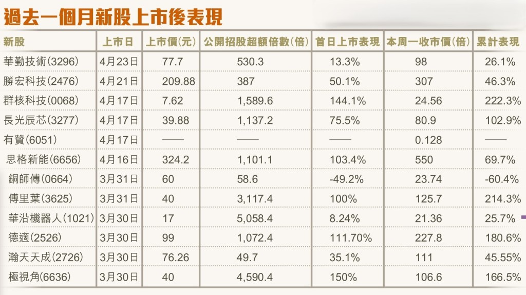 回顧三月及四月上市的新股,二十二隻中有十三隻上周五收市價仍高於首日上市的收市價,意味投資者首日追貨並持有至今仍然有錢賺。例如主攻半導體的傅里葉(3625),三月三十一日首日掛牌已升一倍,截至上周收市,股價比招股價漲逾兩倍。