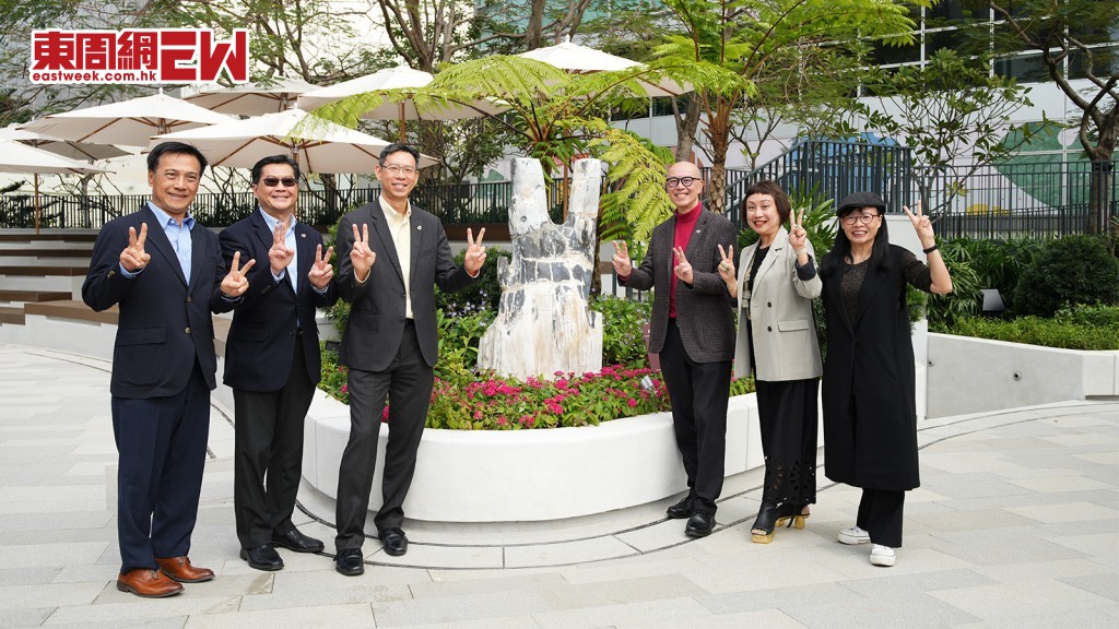 位處荃灣西核心地段的如心園,門外擺放了巨型、點題的如心石,將成為其 中一個打卡熱點。華懋集團執行董事兼行政總裁蔡宏興(左二)、如心園建築 師及策展人陳麗喬博士(右)及首席修復顧問陳承緯(左一),亦在此留影。