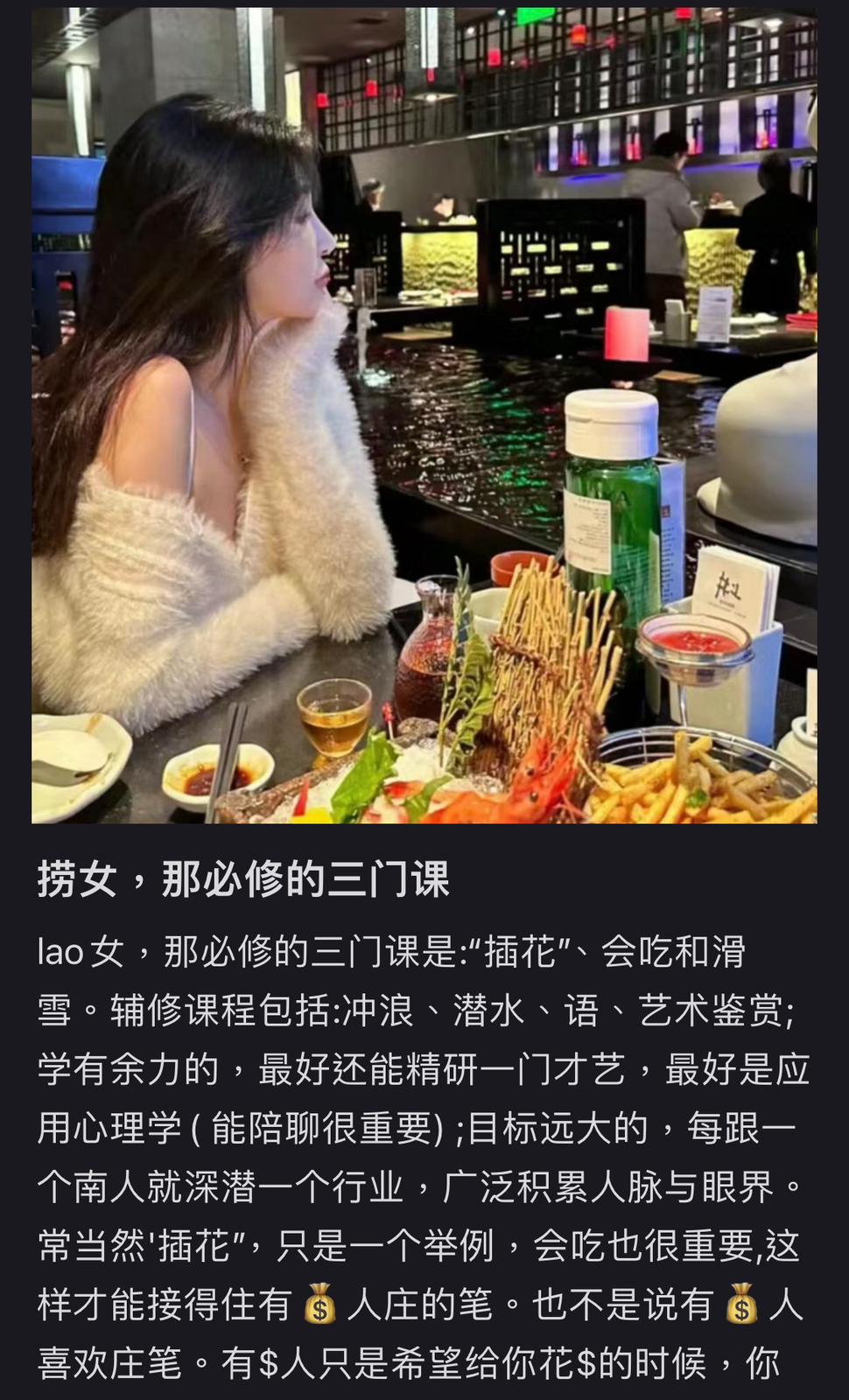這類「情感課程」被指在內地相當流行,其中一門課教女士掌握男人情感分析,包括「yes話術」、「潛意識價值觀植入」等,又教女士「規劃止損」,同男人講錢不講感情。有情感專家更標榜教授「3句話」,就能令男士為女人花費18萬;有學院更宣稱畢業生月入可達30萬人民幣,不用努力工作就能獲得昂貴禮物和物質回報。