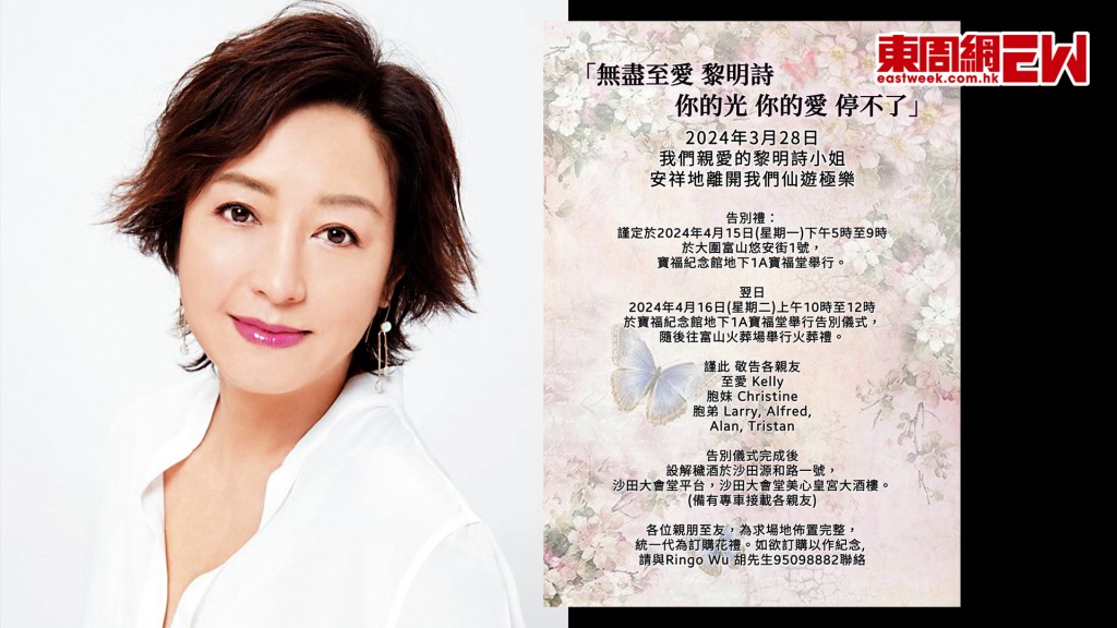 她的告別禮將於4月15日下午五時至九時,於大圍富山悠安街1號,寶福紀念館地下1A寶福堂舉行。