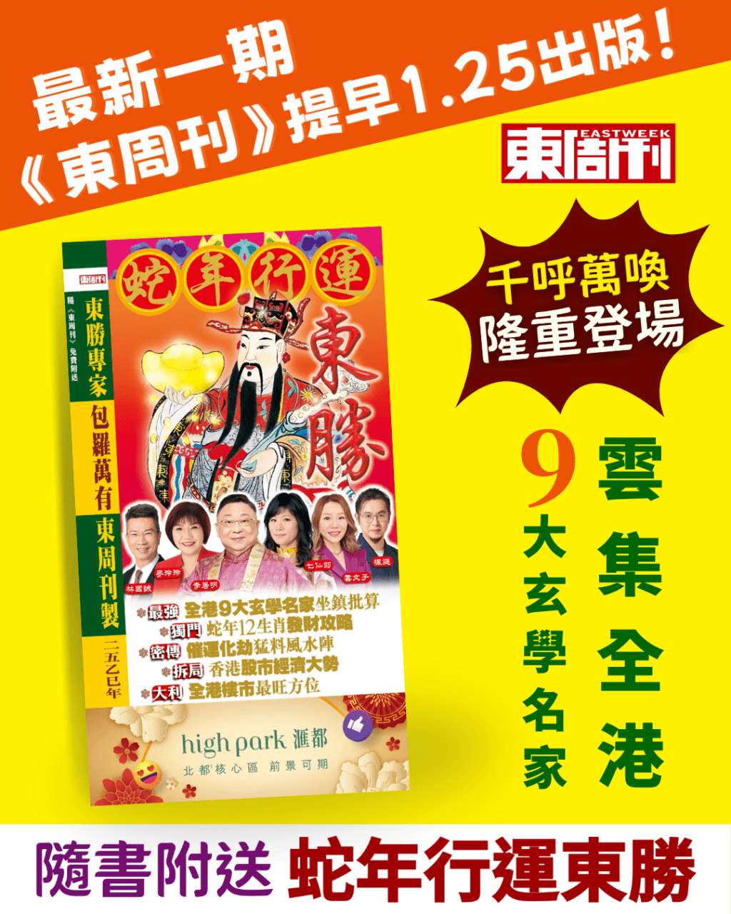 千呼萬喚的《蛇年行運東勝》於1月25日隆重登場,雲集全港9大玄學名家!隨最新第1118期《東周刊》附贈,於便利店、各大報攤發售,記得去買返本睇吓蛇年如何行大運啦!