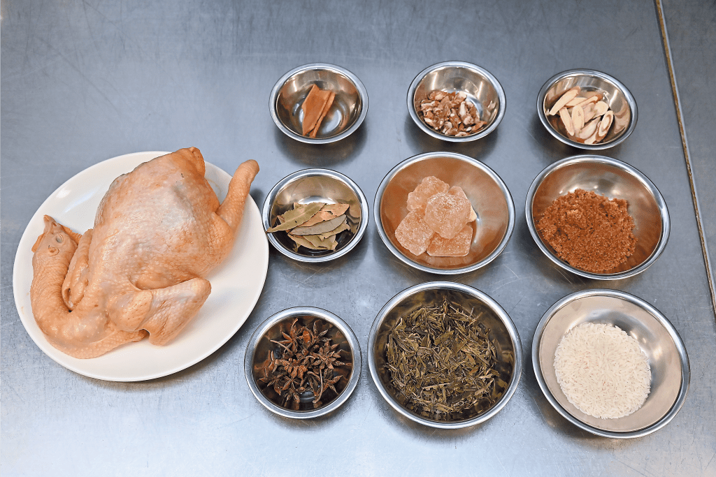 要烹調正宗風味的安徽燻雞,賴師傅教路最重要選鮮雞炮製,他建議選產自廣東的三黃雞。三黃雞屬於走地雞,特點是黃羽、黃喙及黃腳,每隻約重兩公斤,曾是清朝皇室及貴族專享的貢品。三黃雞適合煙燻或燒烤,因骨軟皮脆、肉嫩及雞味濃,而且皮下脂肪豐滿適中,充滿油香。