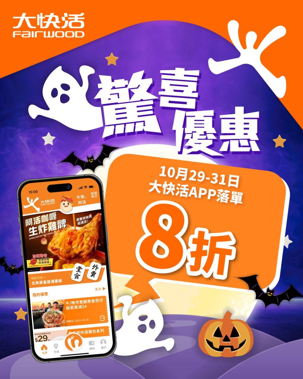 大快活推出萬聖節限時快閃優惠,由2025年10月29日至10月31日(周三至周五)連續三天,全線分店適用!不論是早市、午市、茶市或晚市的全日時段,堂食或外賣均可享全單8折優惠。只需一個簡單步驟:登記成為大快活APP會員,並透過手機APP下單點餐,即可輕鬆享有8折優惠。需注意是,是次優惠並不適用於零售產品、迷你葡撻、茶市阿活爆抵價、$99晚市小菜二人餐、海鮮小菜2人餐、盆菜及派對美食;每張優惠券只限使用一次,且不可與其他優惠同時使用。