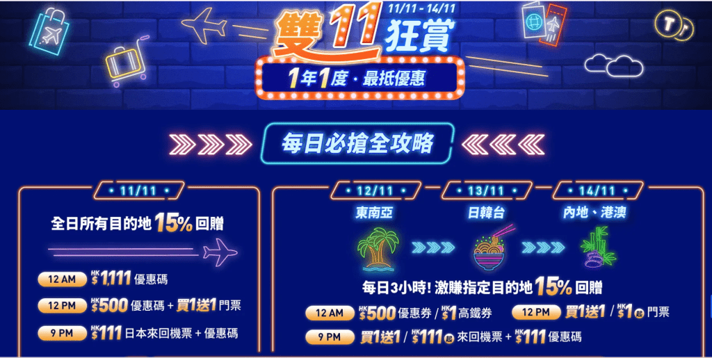 2025雙11優惠|機票優惠|Trip.com將於11月11日起至11月14日,一連四日推出雙11機票及酒店優惠,當中包括香港來回東京機票(連稅)$111、香港來回台北機票買一送一、預訂機票或酒店滿$2,000即減$1,111等多碰超值優惠,即睇優惠詳情及開搶時間!