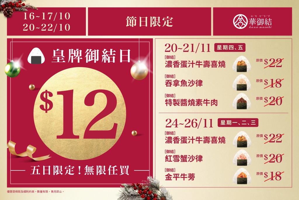 華御結優惠|華御結再度推出$12御結優惠,由即日起的指定五日,包括濃香蛋汁牛壽喜燒(原價$22)、紅雪蟹沙律(原價$20)、吞拿魚沙律(原價$18)、特製醬燒素牛肉(原價$20),以及金平牛蒡(原價$18)等五款人氣御結,均會在不同日子以$12優惠價發售,即睇優惠詳情!