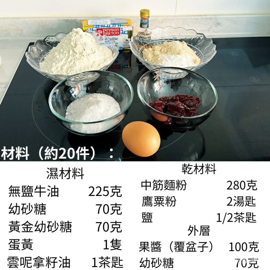 另外,果醬曲奇炮製的過程簡單,靜止和烘焙時間合共約1小時。製作過程只需將乾濕材料混合成麵糰,再塑形便可放入焗爐烘焙。至於添加果醬時,建議將室溫果醬放入微波爐輕輕加熱,以便注入。