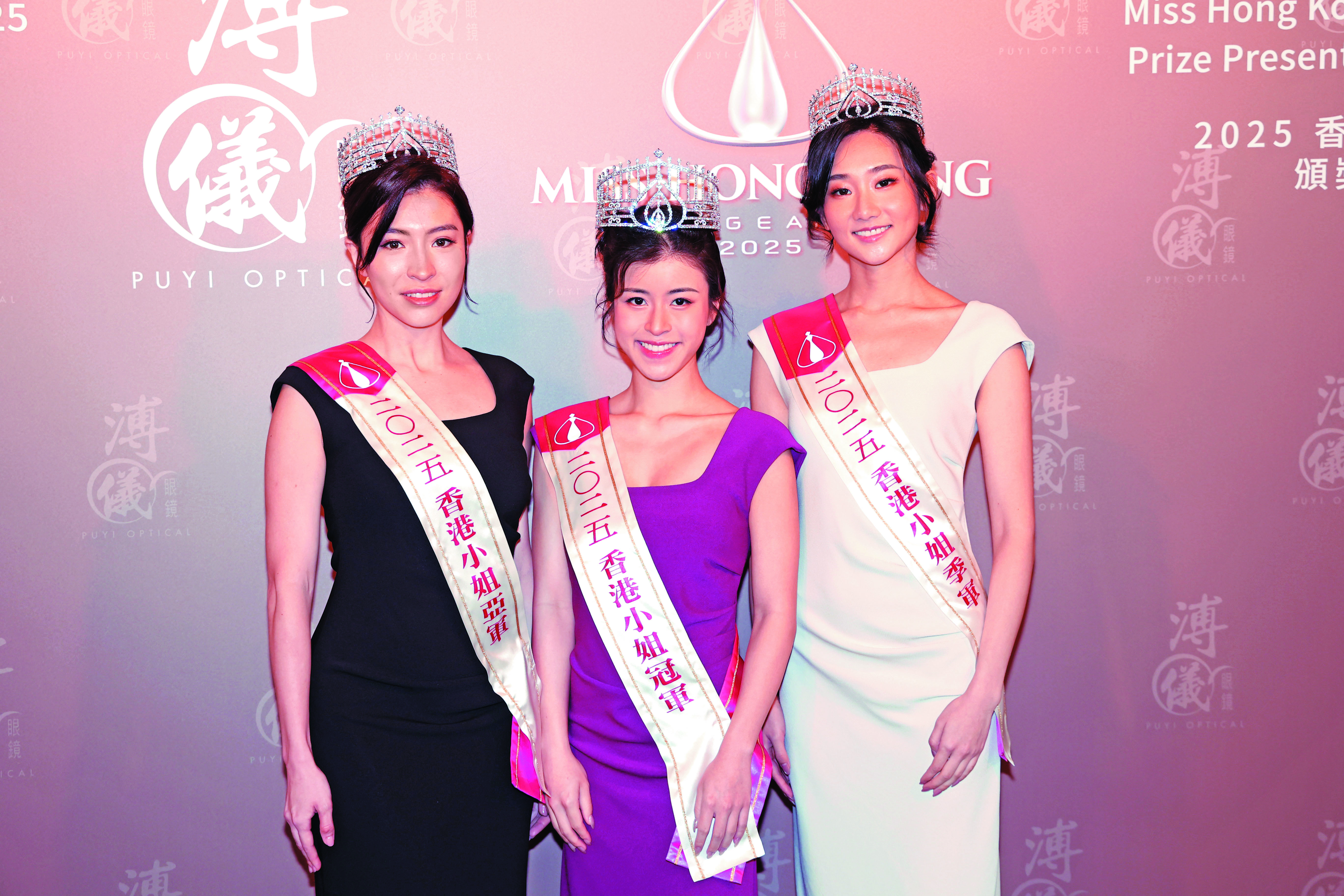 2025年度香港小姐競選冠軍陳詠詩(中)、亞軍施宇琪(左)及季軍袁文靜(右)。