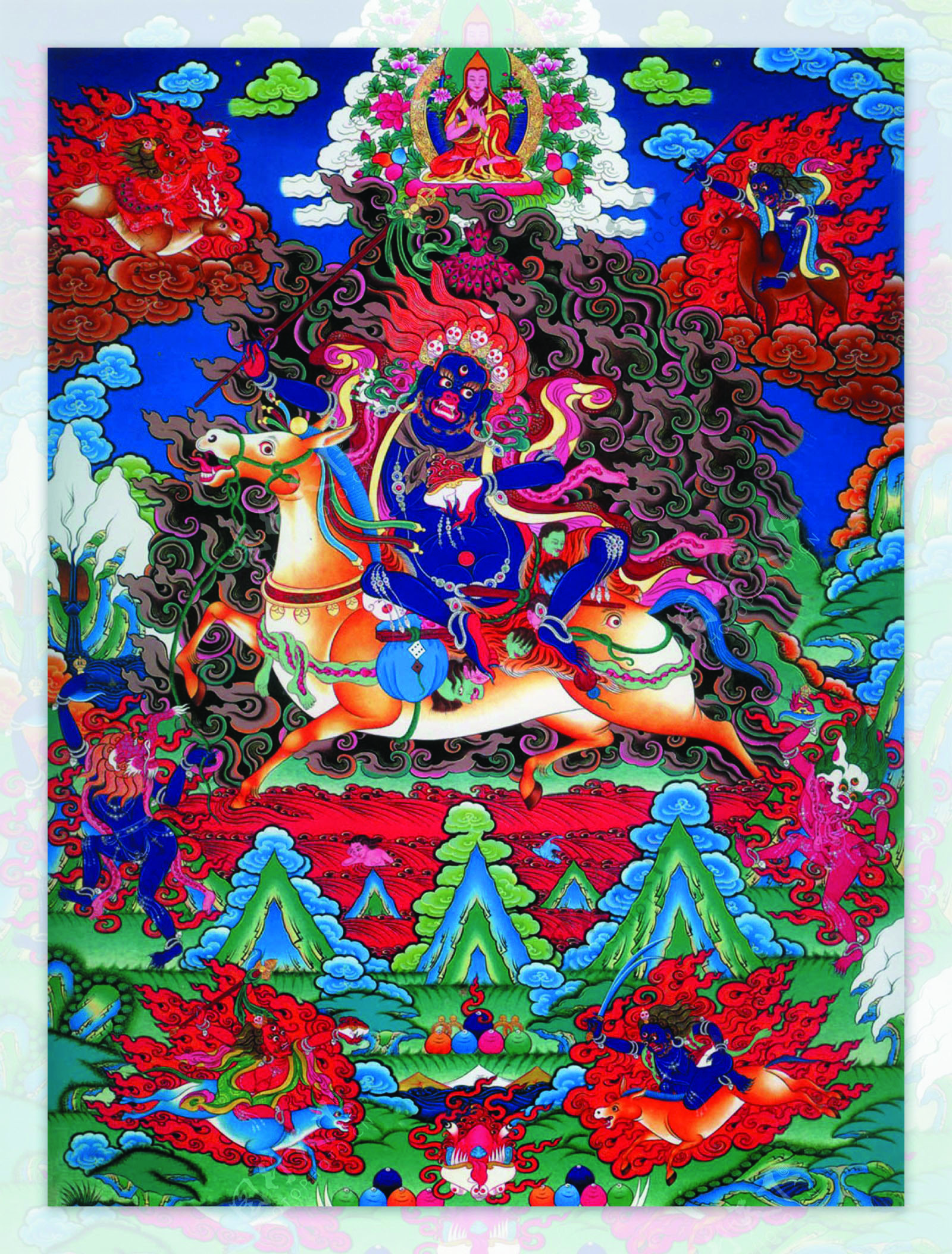 吉祥天母,是藏傳佛教的女相護法神之一,也是拉薩城和達賴喇嘛的守護神,是印度教女神在藏傳佛教中的憤怒化身。唐卡上的吉祥天母,皮膚為藍黑色,側身騎在一頭白騾上,穿行在一片血海中。右手揮舞着她親生兒子的骷髏,左手端着一隻盛着人血的人頭骨,身下的鞍是用她兒子的皮做成。傳說中,她的兒子拒絕同她一起皈依佛教,班達拉姆親手殺死了他,並剝下他的皮。