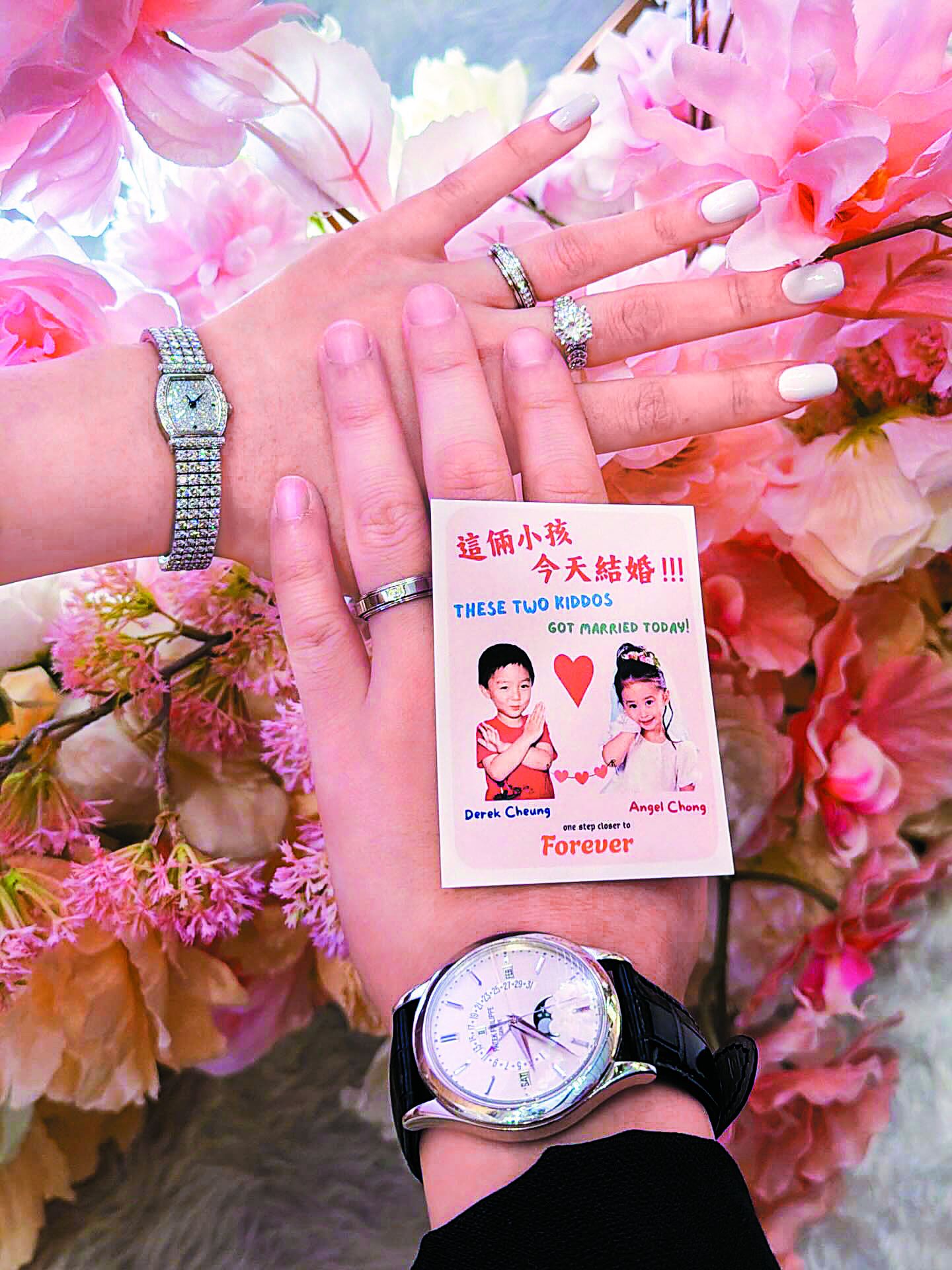 結婚當日Angel在社交網高調宣布喜訊,分享了一張與鍾培生手疊手的溫馨照片,兩人一同展示新婚戒指。