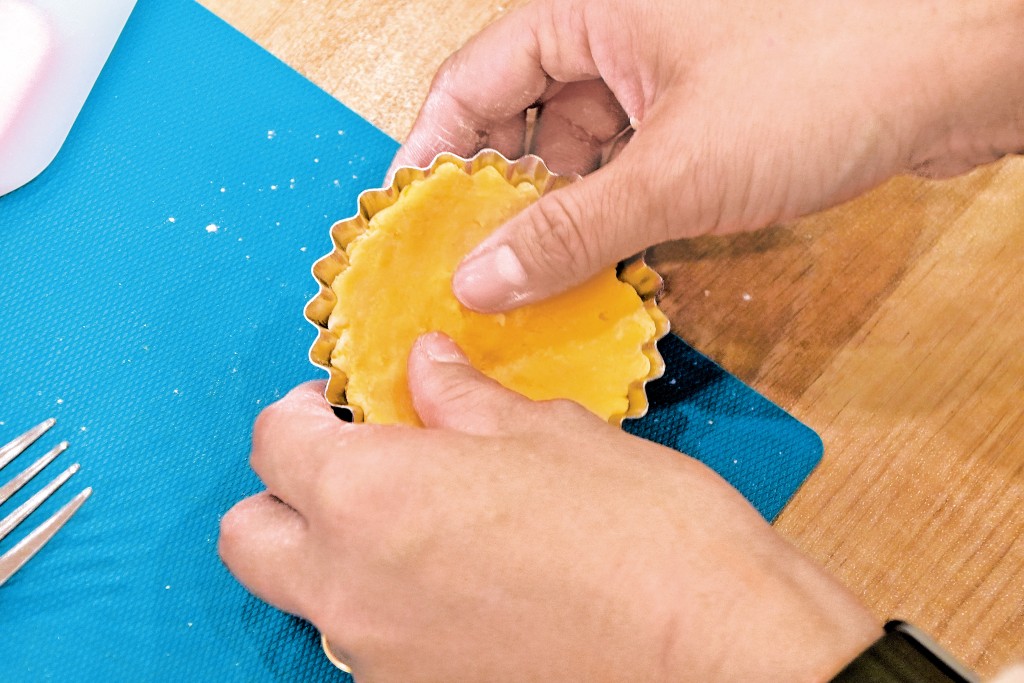 步驟2﹕放在雪櫃內冷藏半小時,之後再放在蛋撻模具內,搓成蛋撻形狀。