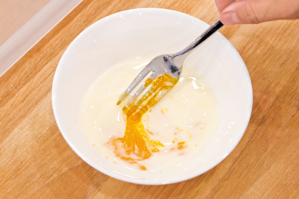 步驟4﹕在蛋黃加入無乳糖牛奶,製成蛋撻液。