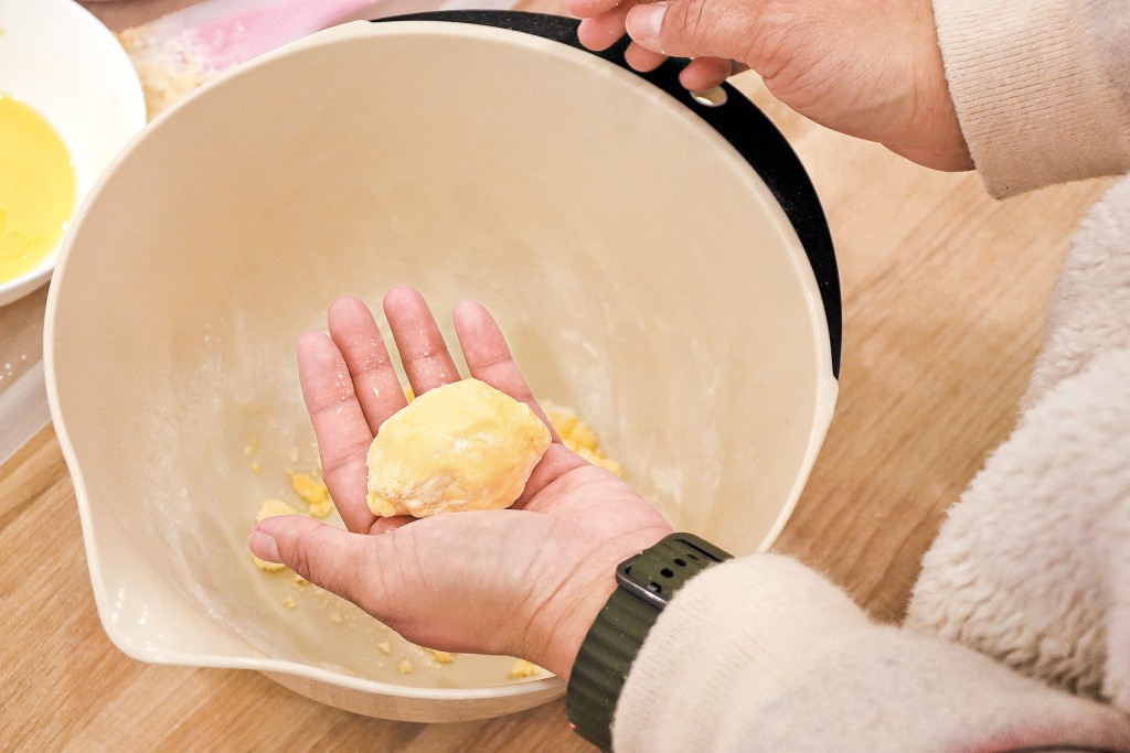 步驟1﹕在麵粉加入蛋黃、無乳糖牛奶拌勻,搓成麵糰。