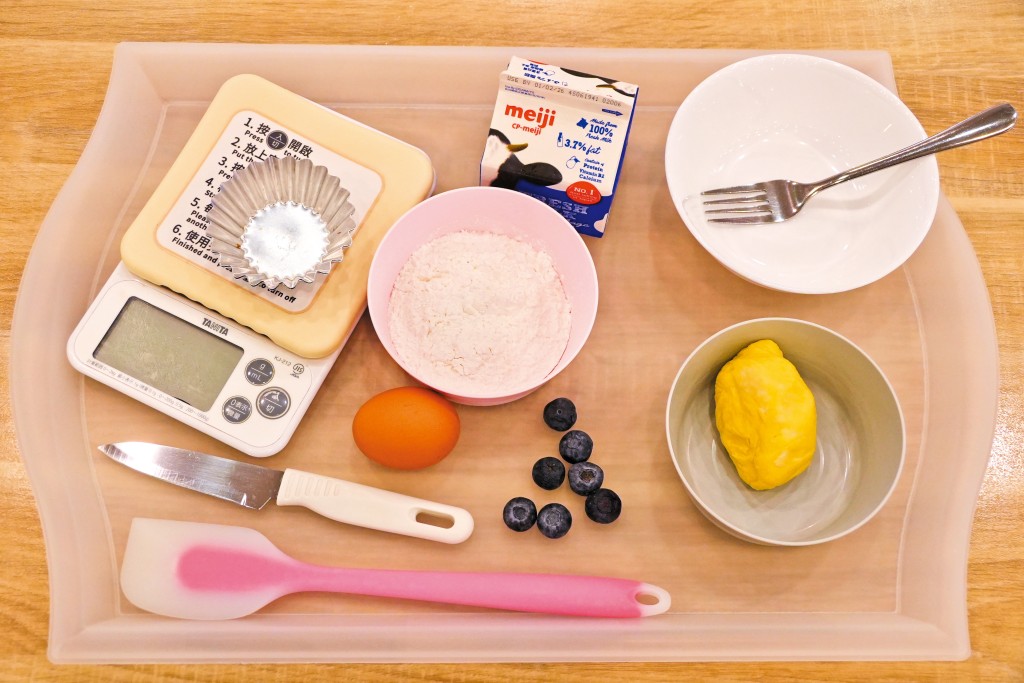 製作毛孩甜品所用的材料及工具包括:無麩質麵粉,蛋黃、無乳糖牛奶、藍莓或士多啤梨、蛋撻模具、焗爐、手套及刀。