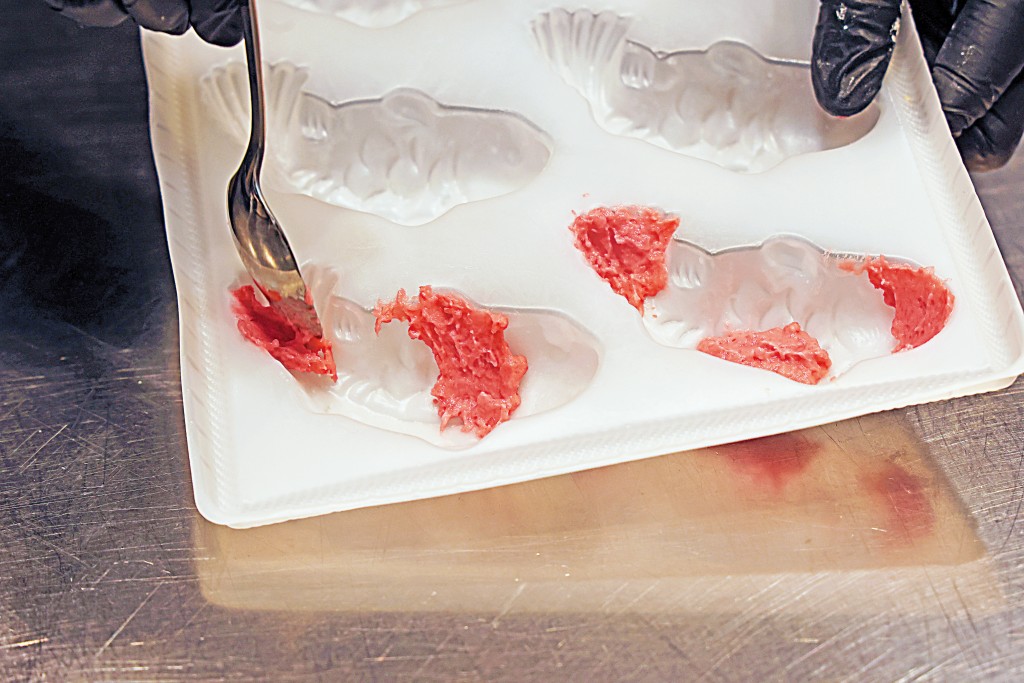在模具掃上椰子油,用匙羹將紅色雞肉泥不規則地塗在模具內。