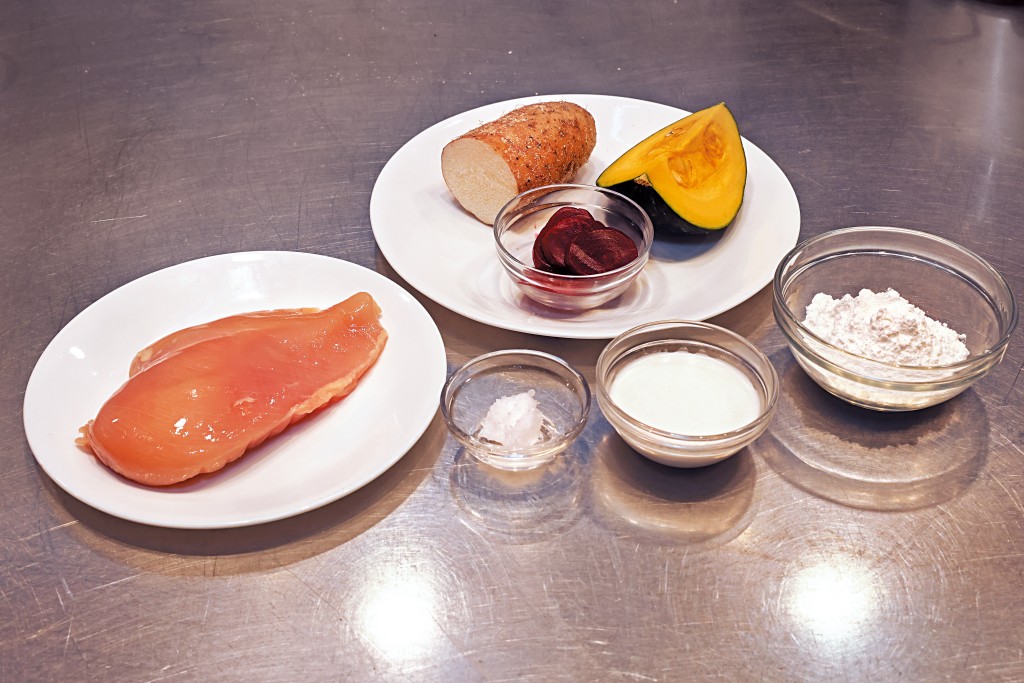 「鯉魚年糕」主要食材有雞肉、南瓜、淮山、烘焙大米粉、無添加椰漿及紅菜頭泥,屬性是「白」的雞肉和淮山,前者低脂高蛋白,容易消化吸收,有助肌肉生長,淮山可健脾胃,補氣養陰,抗炎症,對腸胃敏感的毛孩尤其友好。屬性是「黃」的南瓜,含豐富β-胡蘿蔔素和膳食纖維,保護視力,促進腸道蠕動緩解便秘。屬性是「紅」的紅菜頭,含甜菜紅素、鐵質、葉酸及鉀,具抗氧化、護肝、排毒、降血壓、改善心臟循環,有助提升運動表現等功效。