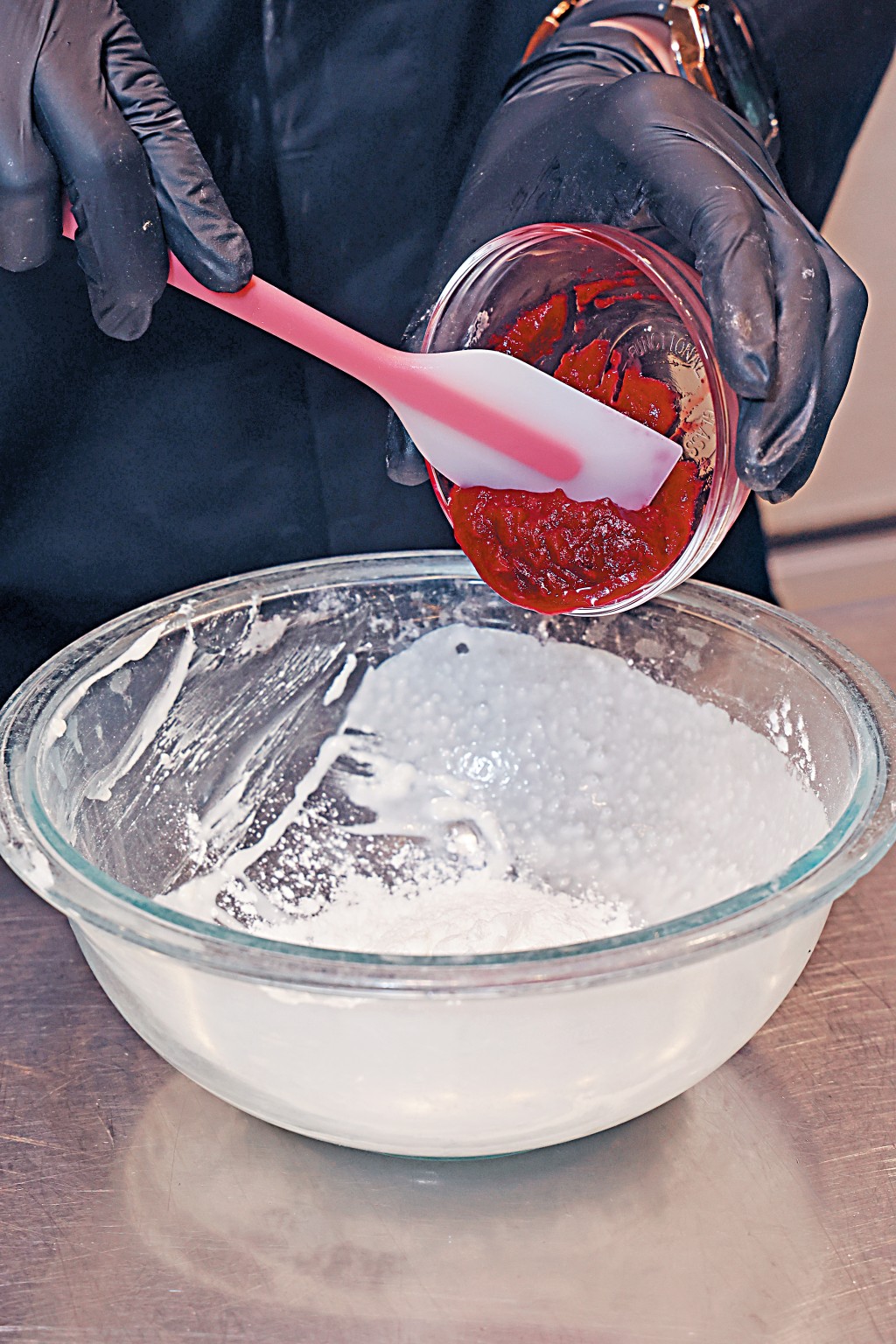 將135克烘焙大米粉、100克水及55克無添加椰漿攪拌成粉漿,然後混入部分雞肉泥攪拌,此為製作年糕的魚身部分。