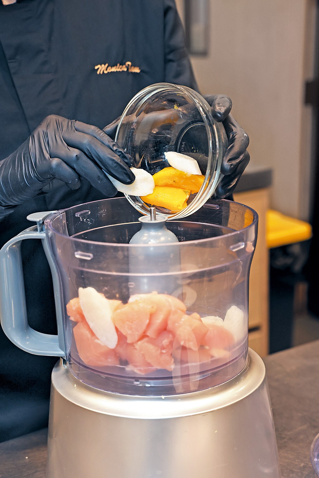將生雞肉、已蒸熟的南瓜及淮山切成小塊後,放入攪伴拌機一同攪拌成泥狀備用。