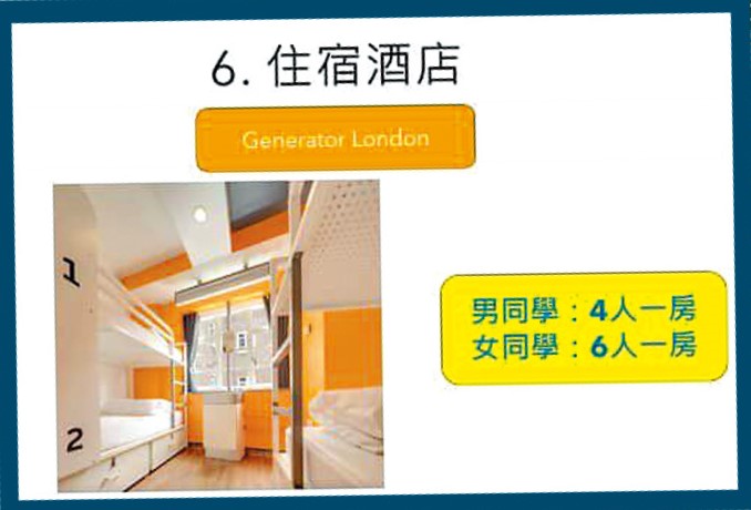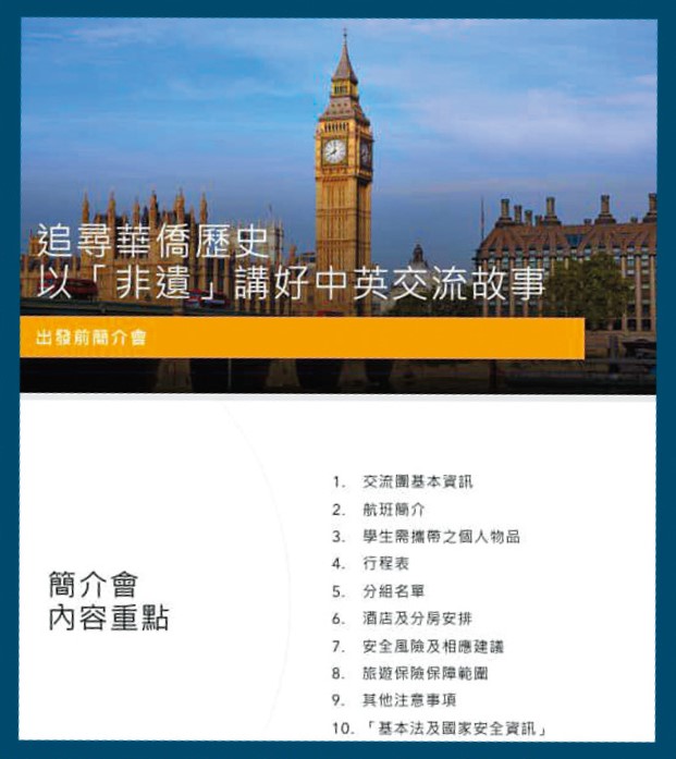 麥太口中的英國交流團,是由「台山商會中學」舉辦,並獲民政及青年事務局資助,活動日期是今年一月三十一至二月十日,學生費用全免。交流團由該校一名助理校長兼化學科老師丘X華統籌,學生主要為中四及中五級,另有一位中六生,連同丘及另外四名同行老師,一行三十多人出發。根據交流團簡介資料,行程涵蓋參觀倫敦大學學院、大英博物館及劍橋大學等。一行人飛抵倫敦後,獲安排入住當地一間青年旅館。