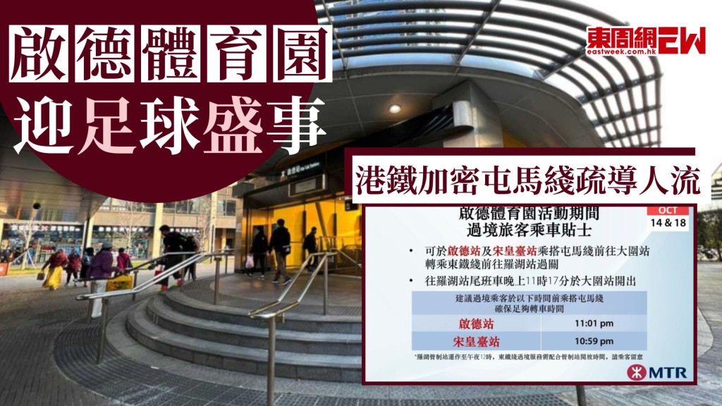 啟德體育園將於今晚間及本週六(18日)傍晚舉辦大型足球賽事,包括港隊對陣孟加拉的亞洲盃外圍賽第三圈及「雙紅會:謝拉特、里奧費迪南邀請賽」。鑑於屆時人流預計大增,港鐵將加強屯馬綫列車服務,以方便市民往返場館。