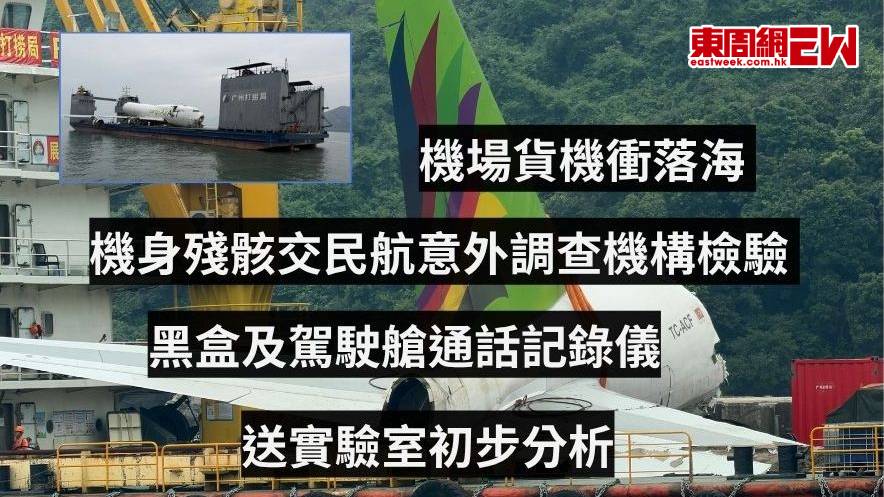 今日早上,貨機的主要殘骸,包括機頭、機尾及中段機身,已由打撈船運送至大嶼山欣澳與馬灣之間的倒扣灣水域,暫時安置於躉船之上。從現場觀察,機頭出現明顯破損,機門處於打開狀態,機翼亦有受損痕跡。