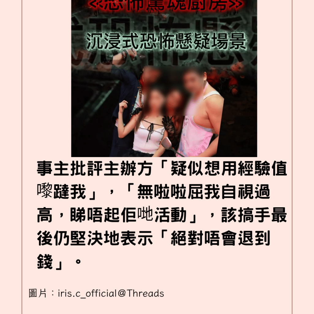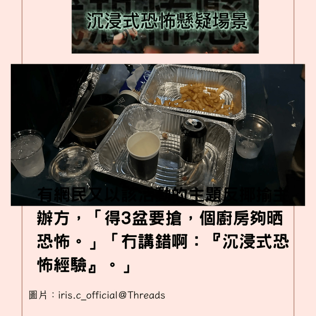 第五個「災區」便是活動主打的「沉浸式恐怖廚房」體驗。據女事主指,她們「辛辛苦苦逼入個廚房,睇佢哋班NPC做戲,地方細,又多人到乜都睇唔到就走出嚟」,質疑主辦方「收咗咁多人錢但冇控制人流」。