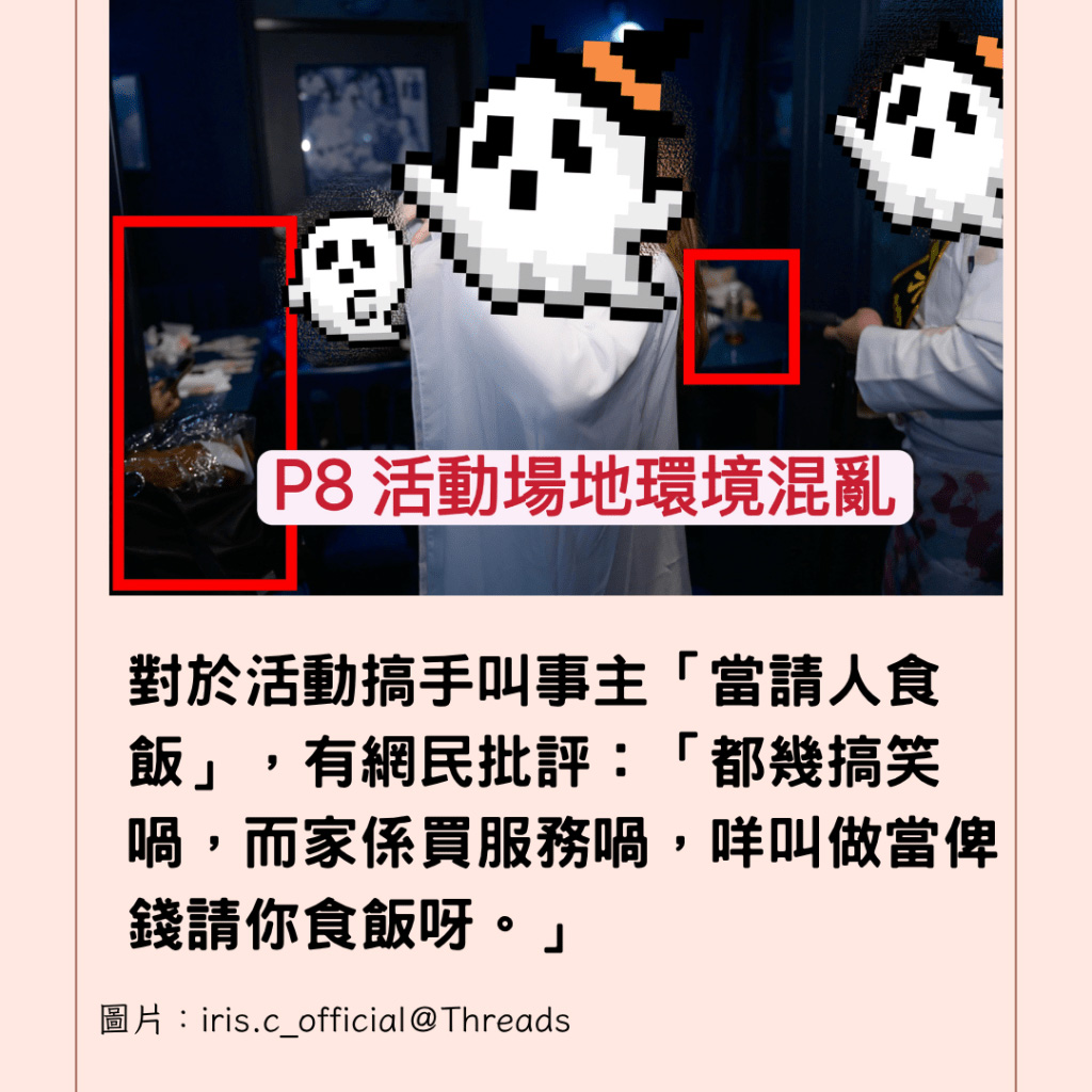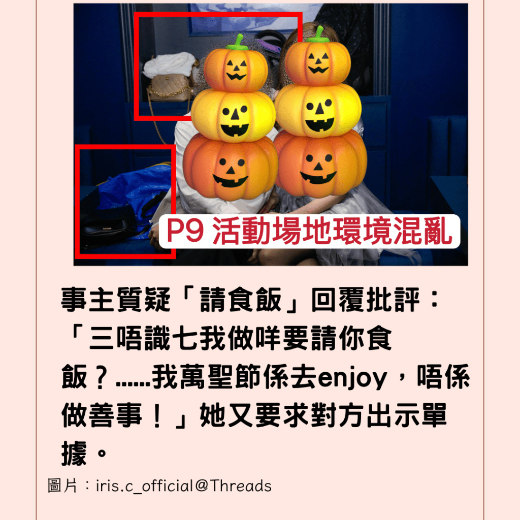 萬聖節參加派對尋開心,結果竟變受難!有女網民日前在社交平台Threads發長文大控訴,指付款550元參加萬聖節派對結果中伏。她力數七大「災區」,不僅沒有人控場,全程零氣氛,且60多名參加者只獲安排3盤食物共享,現場雜物更多到「以為自己去咗垃圾崗」。最後她向主辦方投訴並要求退款,卻反遭到人身攻擊,讓她氣憤不已。